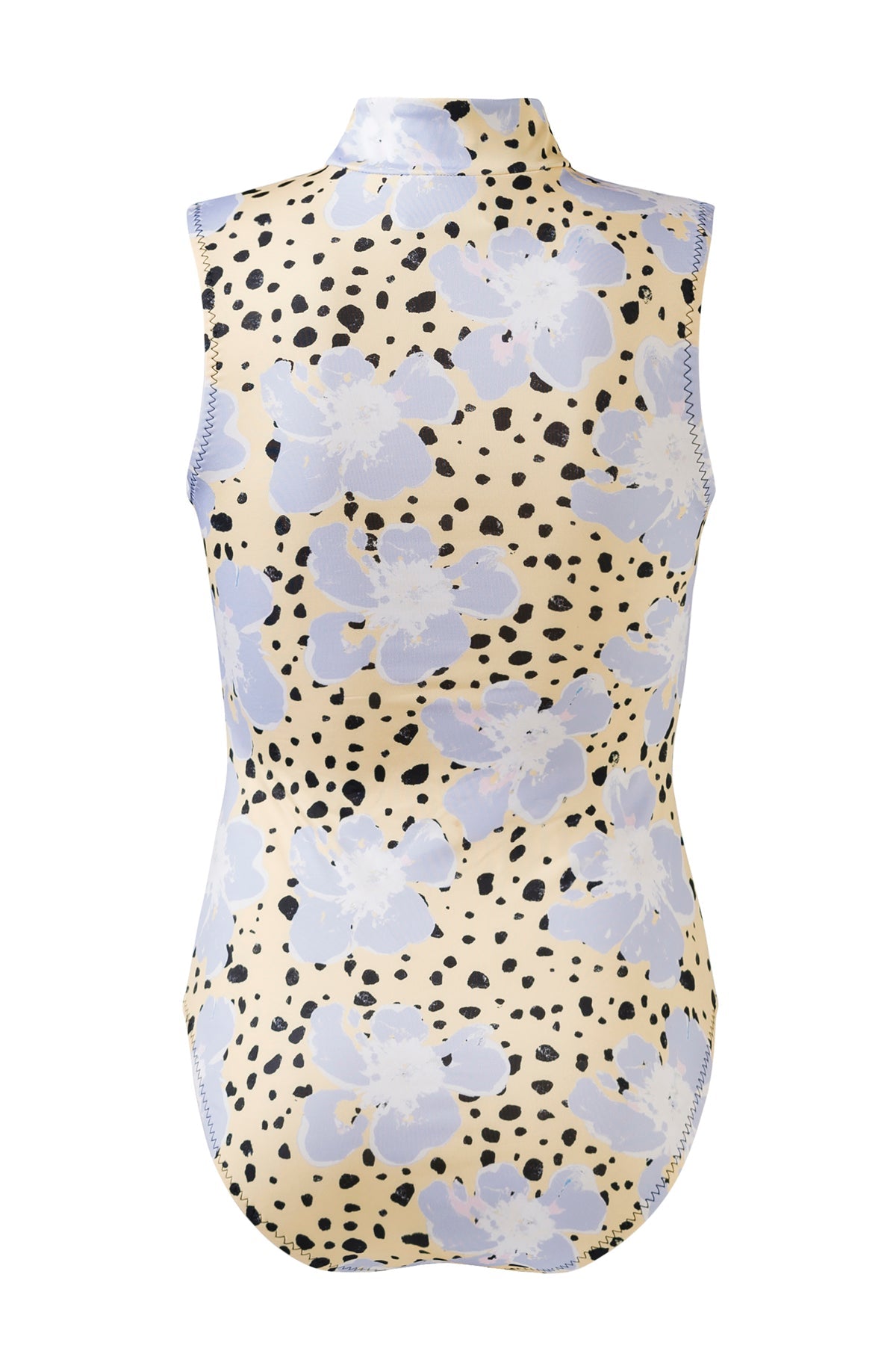 A one piece swimsuit in white print with a eco-friendly zipper. Double fabric with lining. 50+SPF/UPF Sun Protection. Ease to dry.