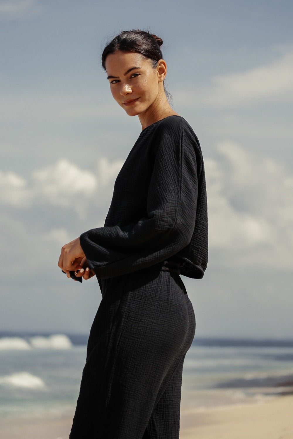 Paloma Paper Bag Pants Black sizi sabahları kumsala, akşamları ise açık havada akşam yemeğine götürecek kadar şıktır. Ayrıca kullanım kolaylığı sağlayan ayarlanabilir el yapımı örgülü kemere sahiptir.