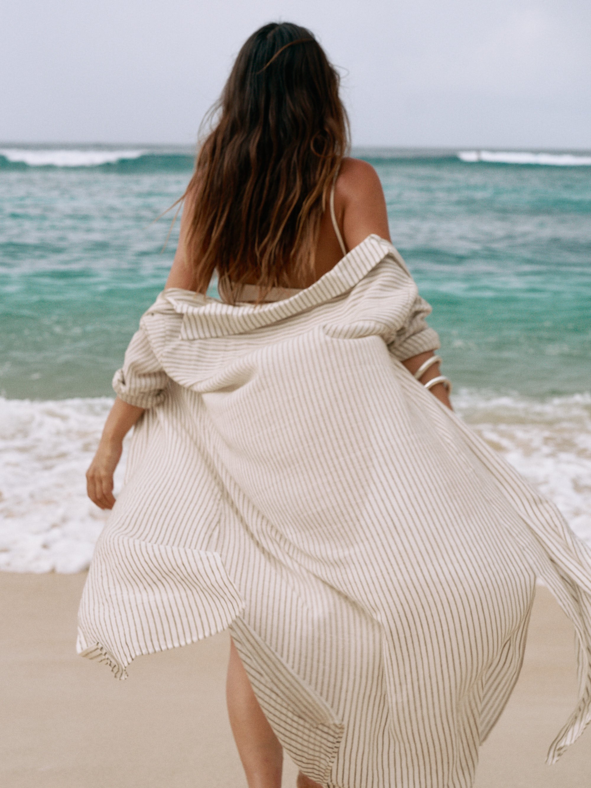 Düğmeli ön kısmı ve rahat kesimiyle, bu çok yönlü gömlek elbise, zahmetsizce şık bir görünüm sunar. %100 Türk pamuklu, yumuşak, çizgili kumaş ile üretilmiştir ve mayo üzerine düğmeleri açık yada kapalı şekilde şık bir plaj elbisesi olarak kullanılabilir. Klasik yakası ve katlanabilir kollarıyla, yaz gardırobunuzun vazgeçilmezi olacak, plajda rahat bir gün geçirmek ya da tatil günlerinde şıklığınızı yansıtmak için mükemmel bir seçimdir.