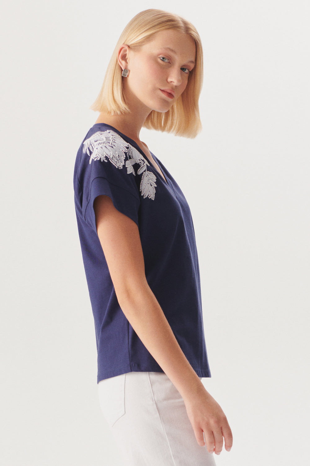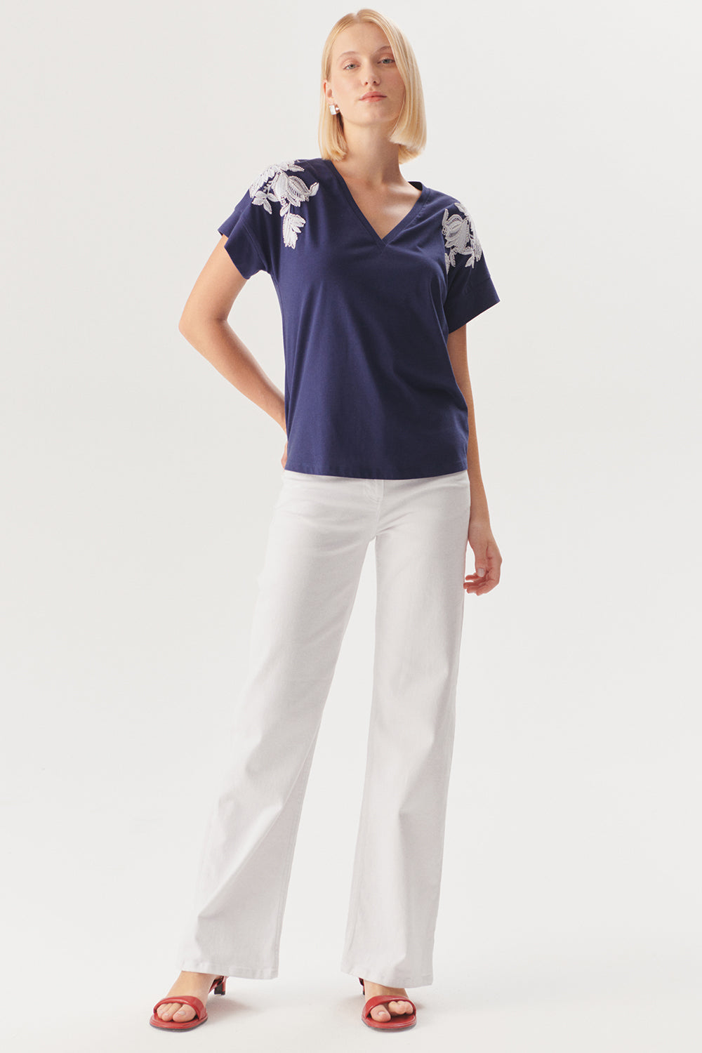 Şıklığı ve rahatlığı bir arada sunan bu V yaka lacivert pamuklu t-shirt, zarif işleme detayları ile dikkat çekiyor. Omuz kısmında yer alan çiçek motifli işlemeler, t-shirt’e sofistike bir hava katarken, regular fit kesimi sayesinde konforlu bir kullanım sunar. Günlük kombinlerinize zarif bir dokunuş katmak için ideal bir seçimdir.