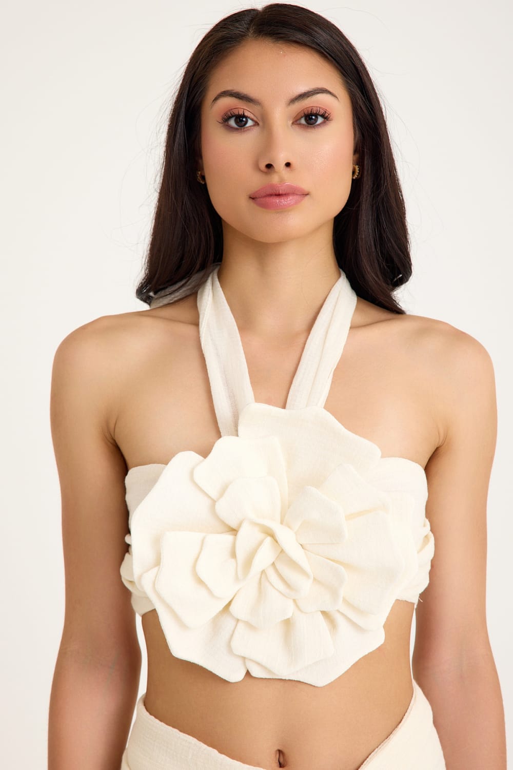 Çıkarılabilir çiçek süslemeli bralet, kişiselleştirilebilir görünümlere olanak tanır. %100 pamuktan üretilen bu ürün, sıcak havalar için mükemmel, yumuşak ve nefes alabilen bir his sunar. Bu parça, kıyafete dramatik, heykelsi bir unsur kazandırmak için çiçekle birlikte veya daha basit, modern bir görünüm için çiçeksiz olarak giyilebilir. Braletin arka kısmında gizli bir fermuar bulunur ve bu da güvenli ve güzel bir uyum sağlar.