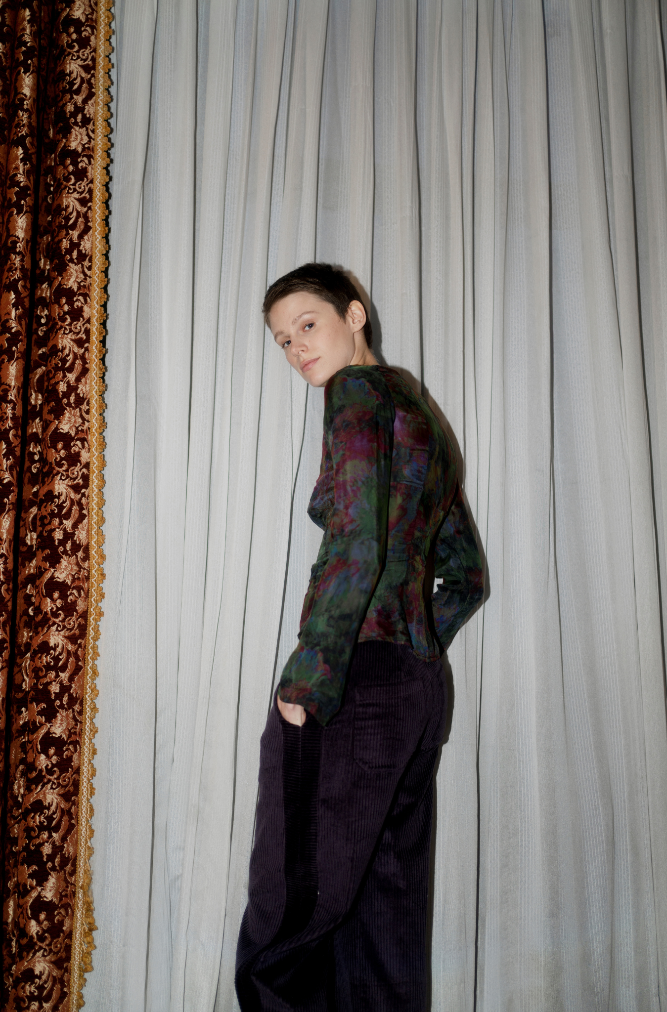 Desiree Top, dökümlü uzun volanlı kolları ve arka ortadaki gizli fermuarıyla zarif bir silüet sunar. Swirl deseniyle dikkat çeken bu tasarım, çok mevsimlik kullanıma uygun olup tek başına ya da katmanlı stillerde şıklığı tamamlar.
