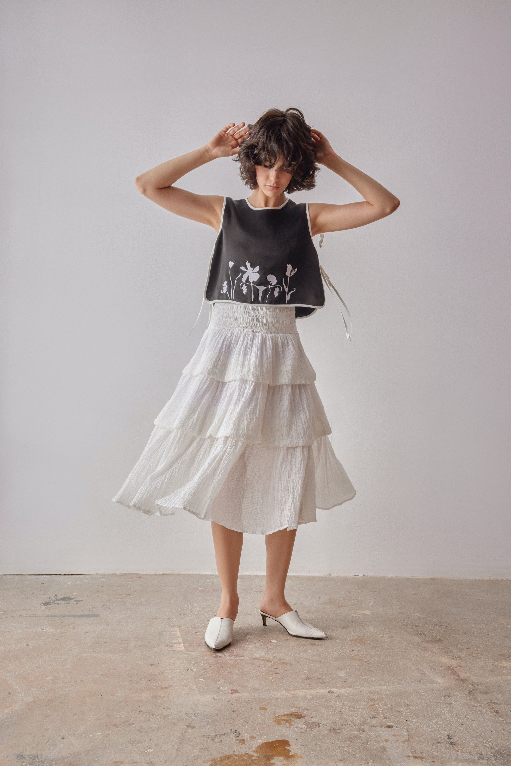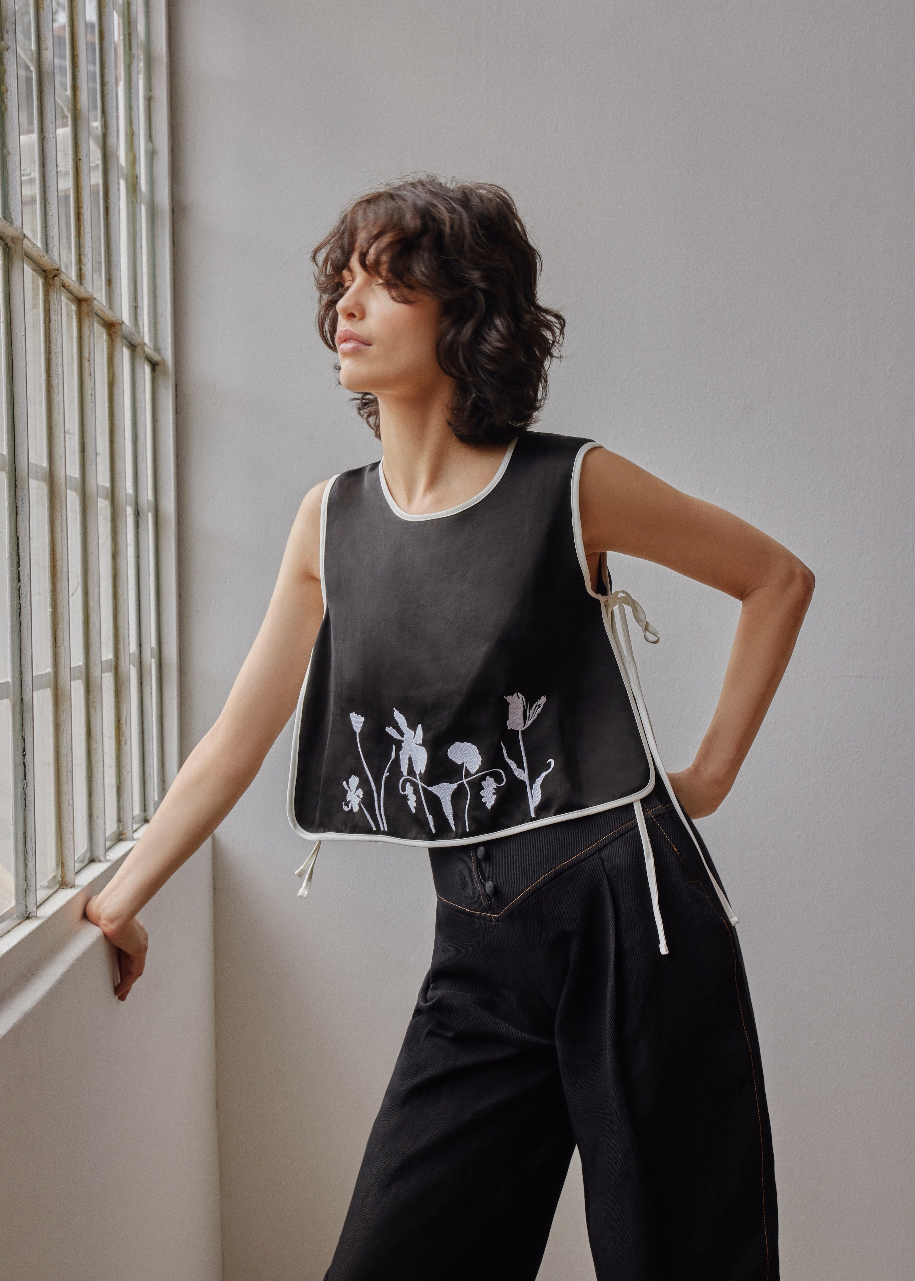 Gardırobunuza modern bir dokunuş katın! Maya yelek üst, apron stili kısa kesimiyle sofistike bir görünüm sunuyor. Saten keten-viskon karışımından üretilen bu özel parça, OhSevenDays tasarımı nakış çiçek detaylarıyla romantik bir zarafet taşıyor. Yanlardaki kontrast renk bağcıklar ayarlanabilir formuyla cesur bir görünüm kazandırıyor. Hem tek başına hem de katmanlı stillerde rahatlıkla kullanılabilir.