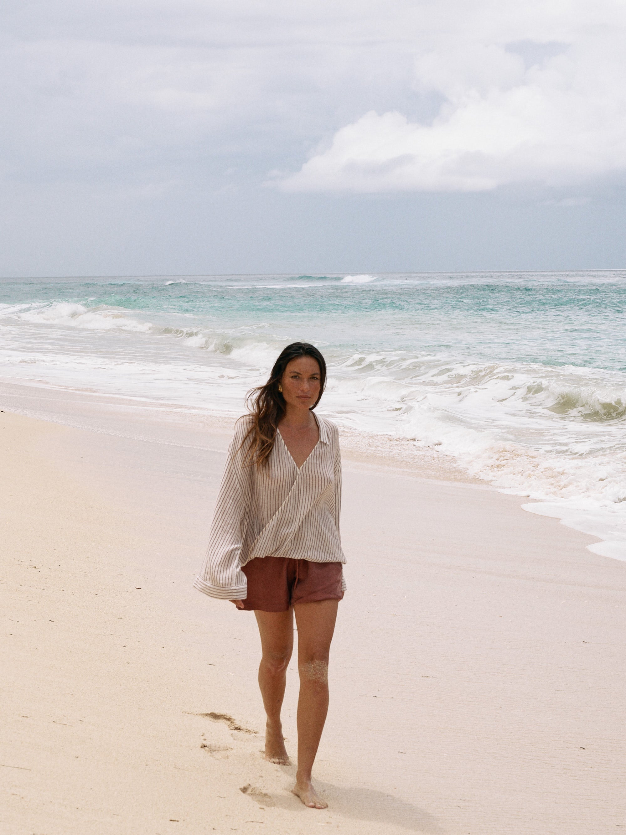 Sade Top Burgundy Stripes, ön çapraz drape detayı tarzınıza romantik bir hava katar. Geniş kollar ve uzun arka dökümlü kesimiyle kumda yürüyüşler yapmak veya yaz akşamları giymek için ideal bir parçadır.