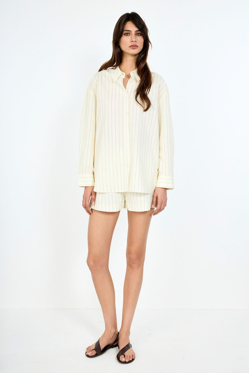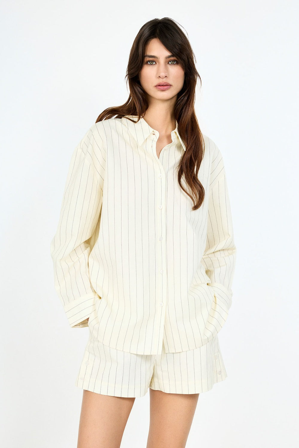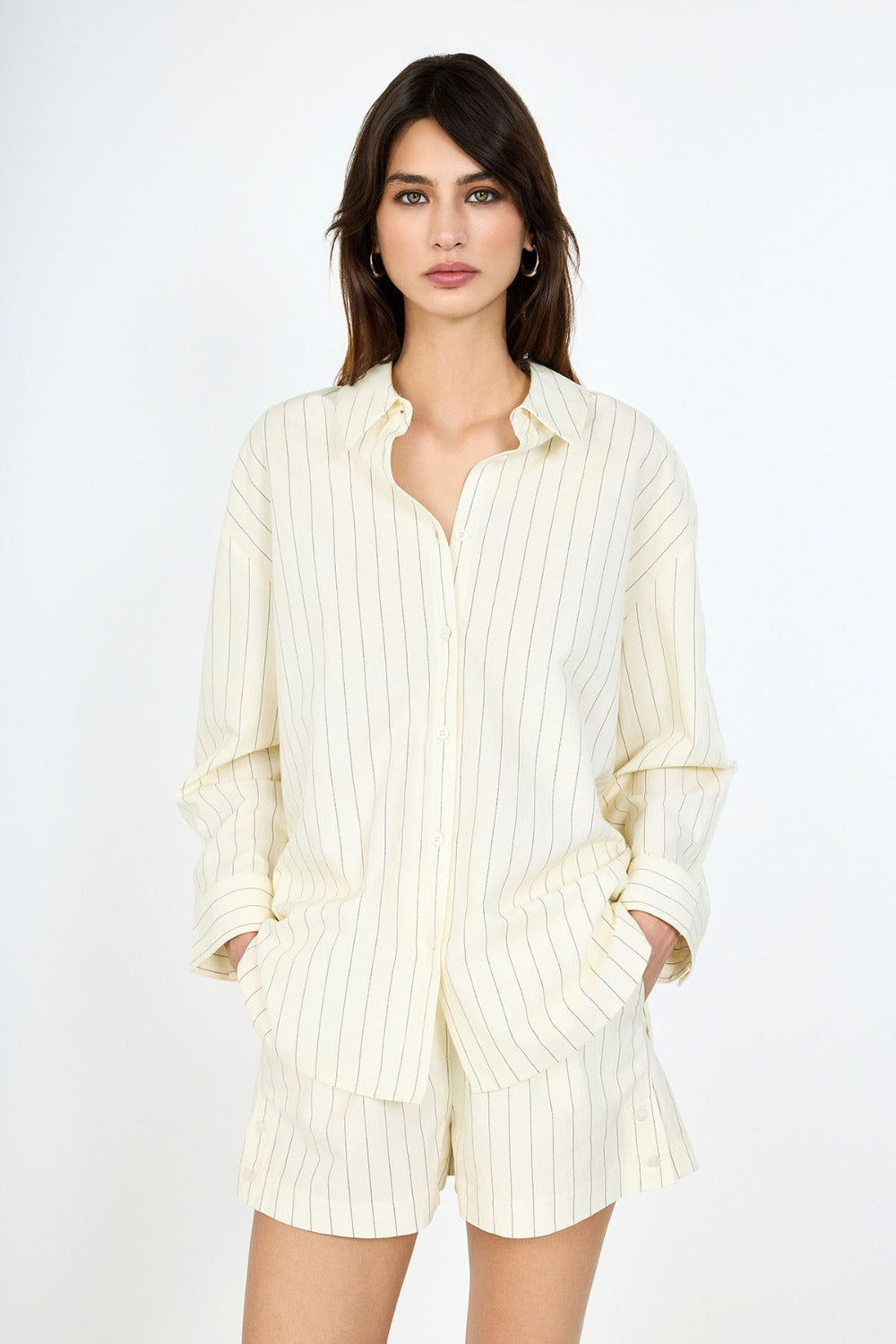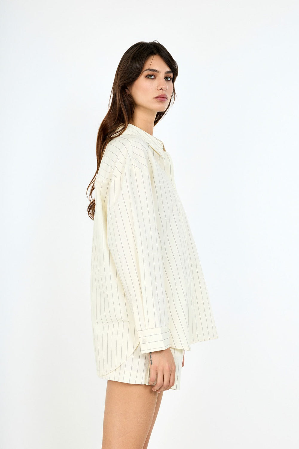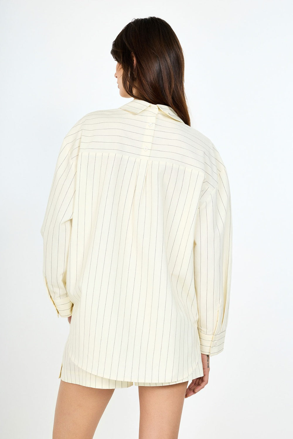 Oversize kesimi sayesinde gün boyu maksimum rahatlık sağlayan bu gömlek, yaz ve bahar mevsimlerinin kurtarıcı parçası olmaya aday. Arka kısmındaki düğme detayı ve bej tonlarındaki çizgili kumaşıyla fark yaratıyor.