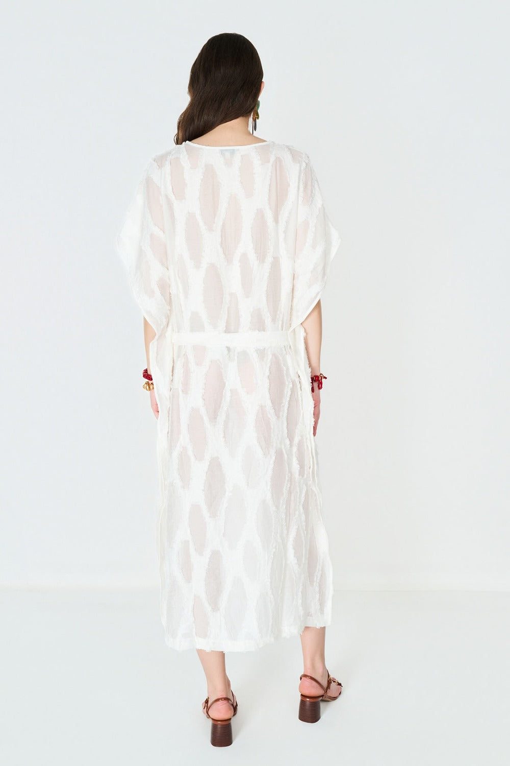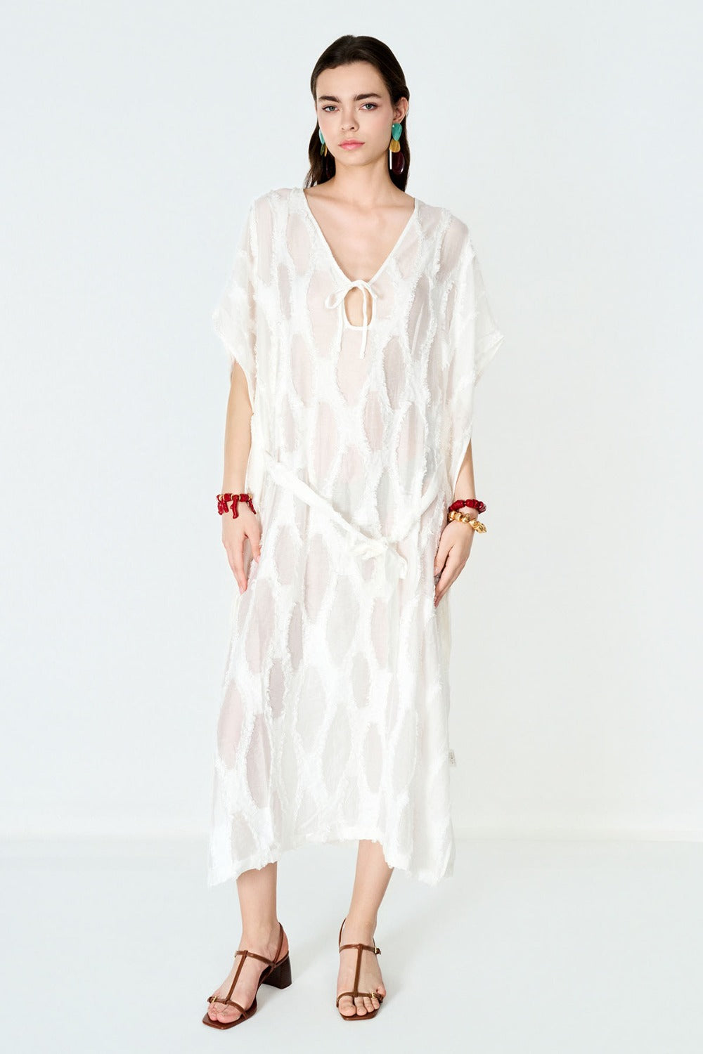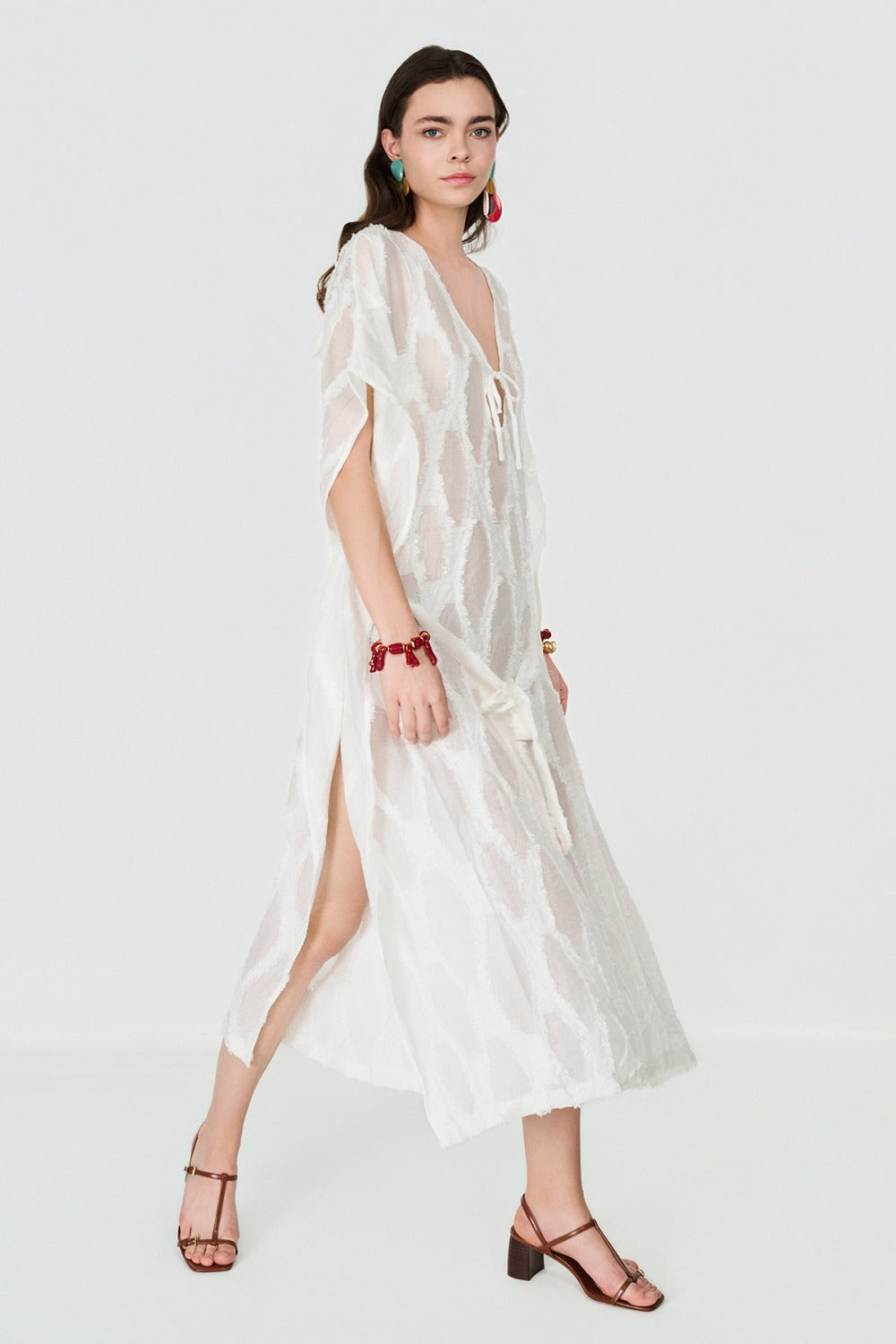 Boneqa’nın özel Design koleksiyonuna ait bu Beyaz Jakarlı Elbise, yaz mevsiminin vazgeçilmez parçalarından biri olmaya aday. Derin V yakası, düşük kol oyukları ve yüksek yan yırtmaçları sayesinde, özellikle bikini ve mayo üzerine giymek için mükemmel bir seçim sunar.