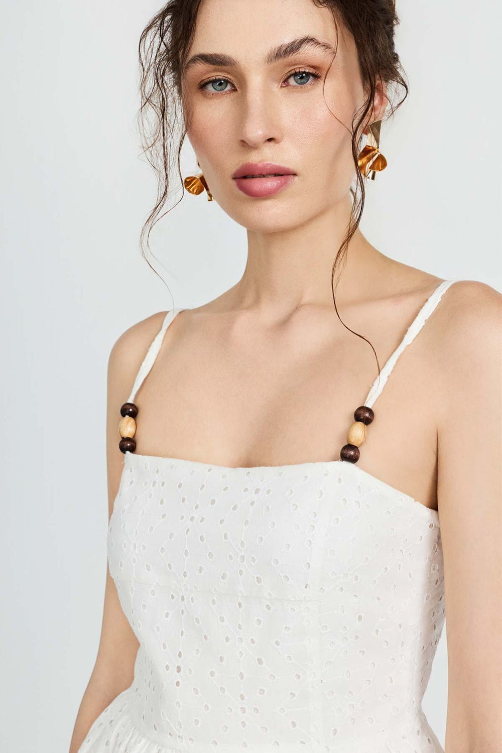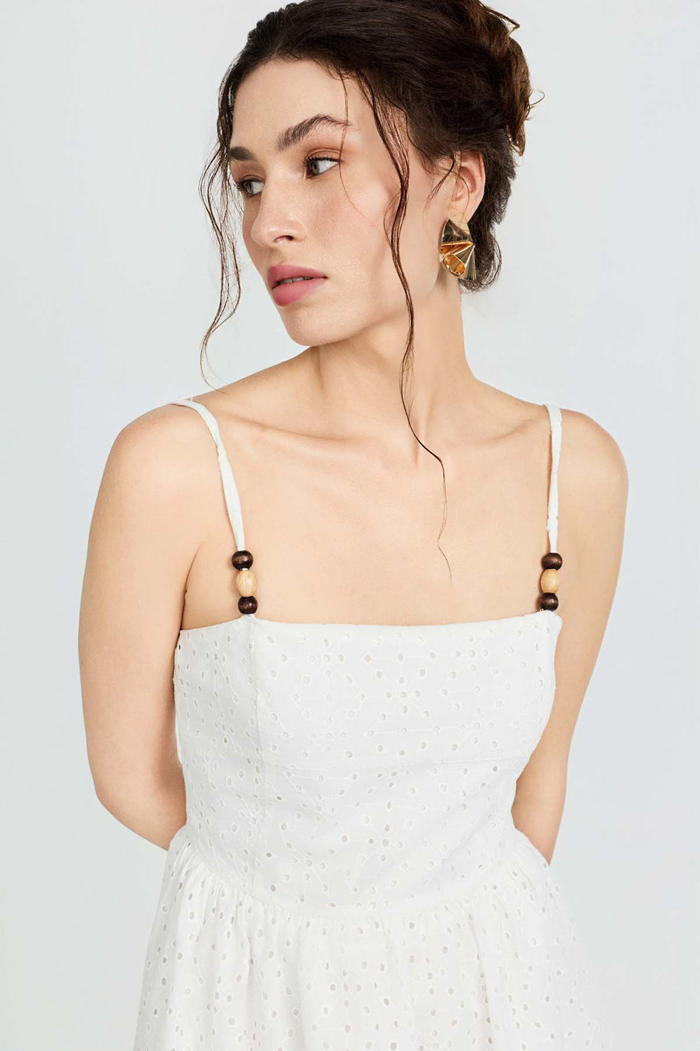 Pamuklu kumaşı ile yumuşak dokusu bu brode kumaştan tasarlanan elbisede hem şık hem de rahat bir görünüm sunuyor.