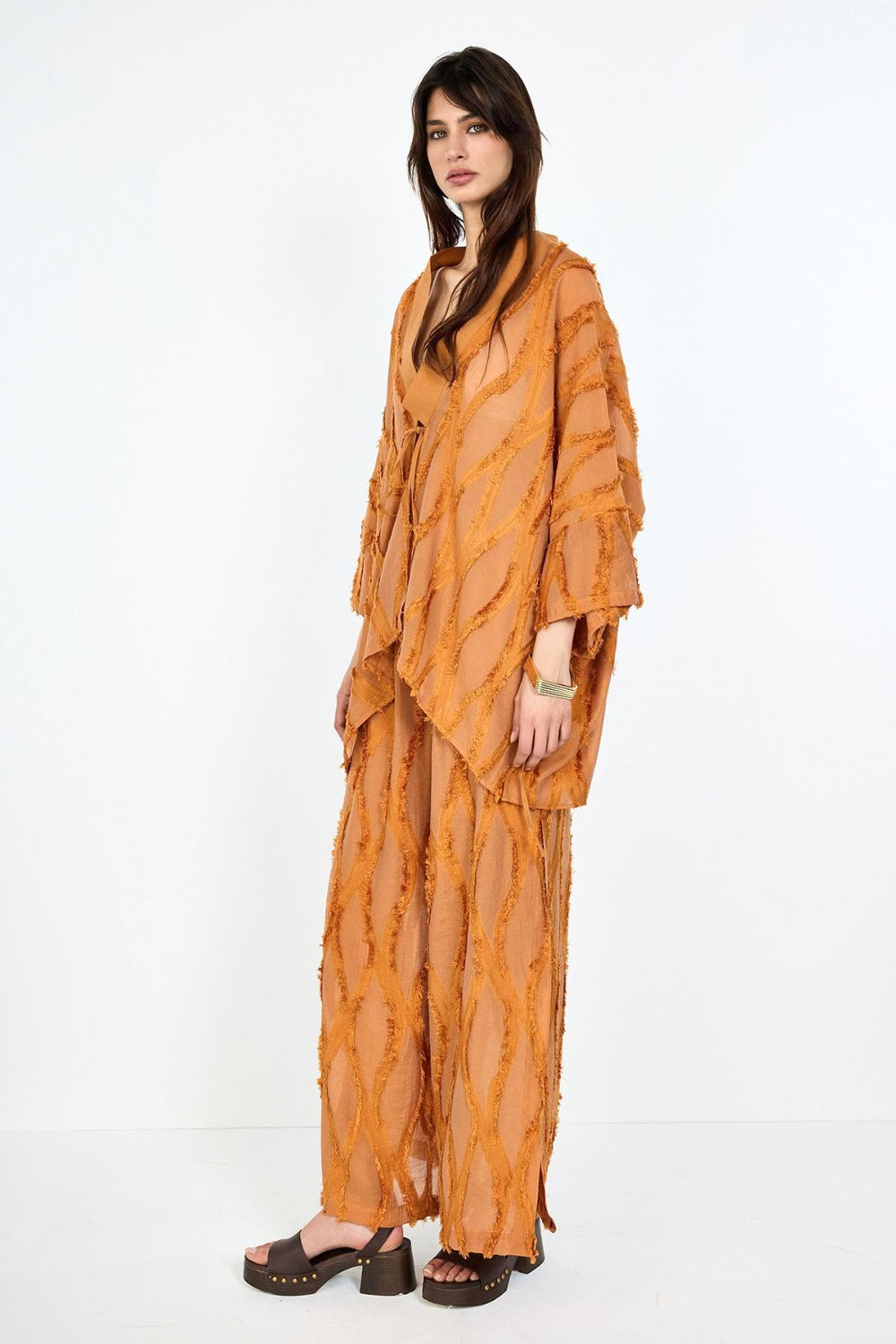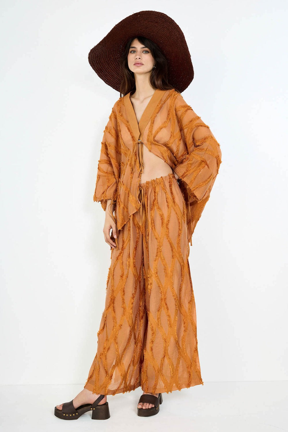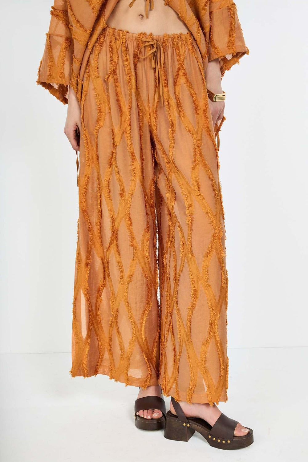 Boneqa’nın yaz koleksiyonundan çıkan bu kahverengi jakarlı pantolon, zarafet ve konforu aynı anda sunan bir yaz klasiği. Geniş paça formu, dökümlü yapısı ve jakar panelli kumaş dokusuyla hem şehir şıklığında hem de tatil kombinlerinde öne çıkan bir parça.