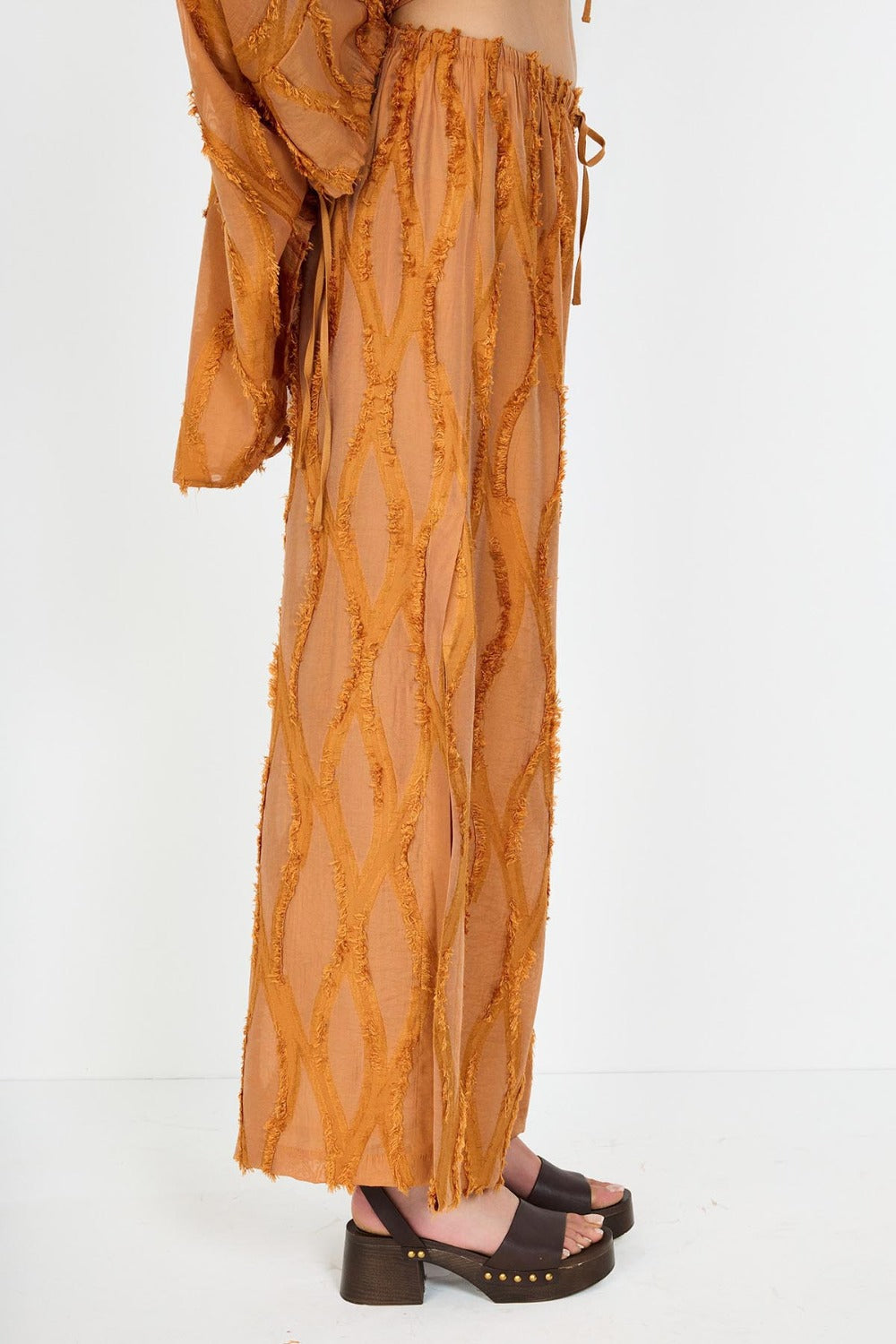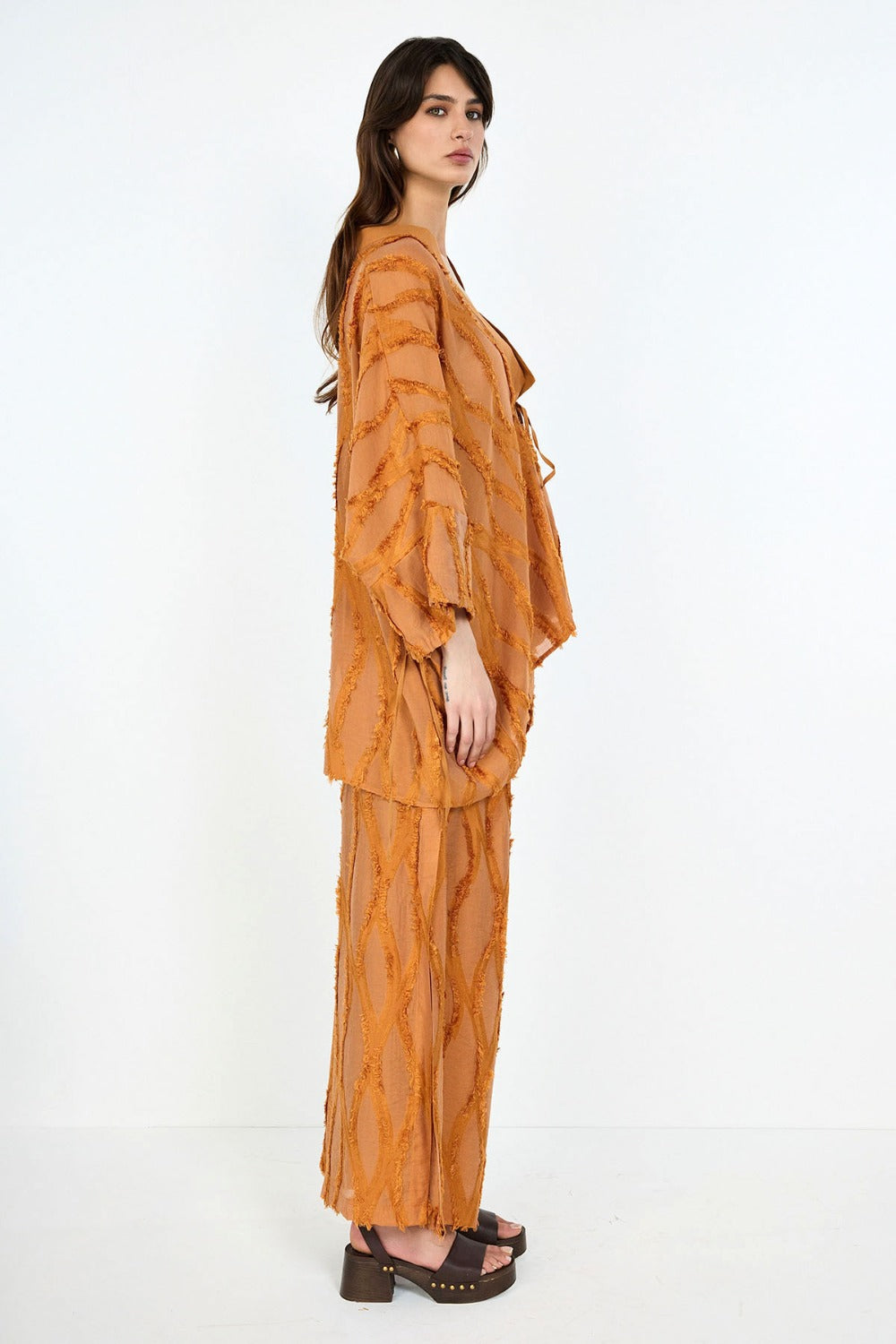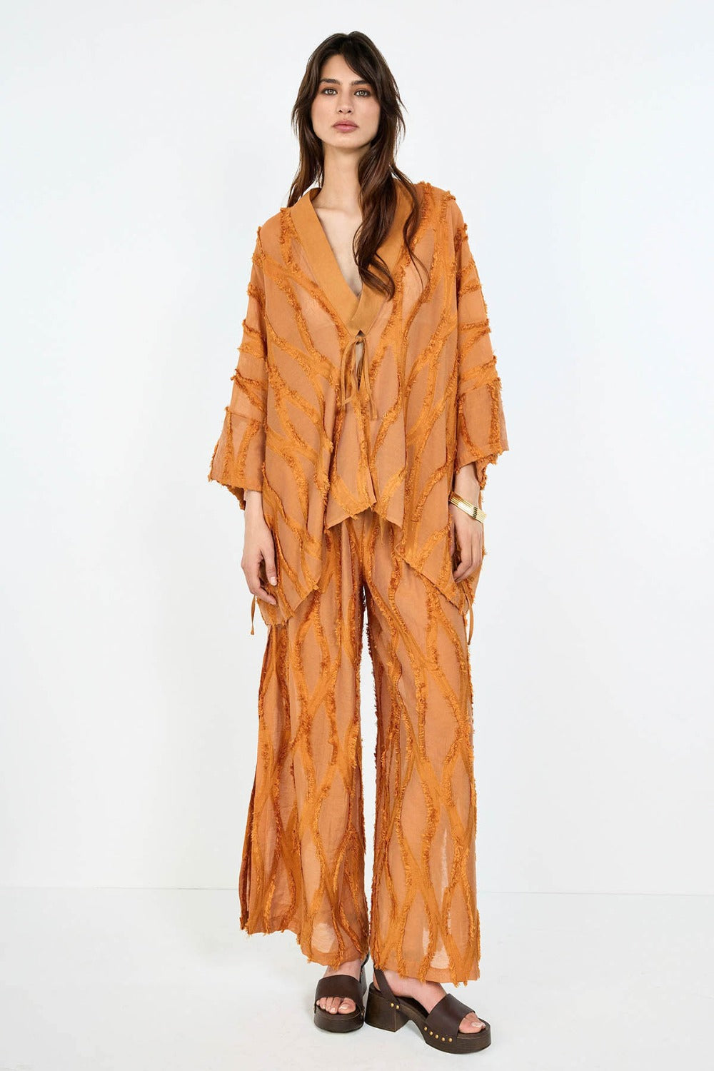 Boneqa’nın yaz koleksiyonundan çıkan bu kahverengi jakarlı pantolon, zarafet ve konforu aynı anda sunan bir yaz klasiği. Geniş paça formu, dökümlü yapısı ve jakar panelli kumaş dokusuyla hem şehir şıklığında hem de tatil kombinlerinde öne çıkan bir parça.