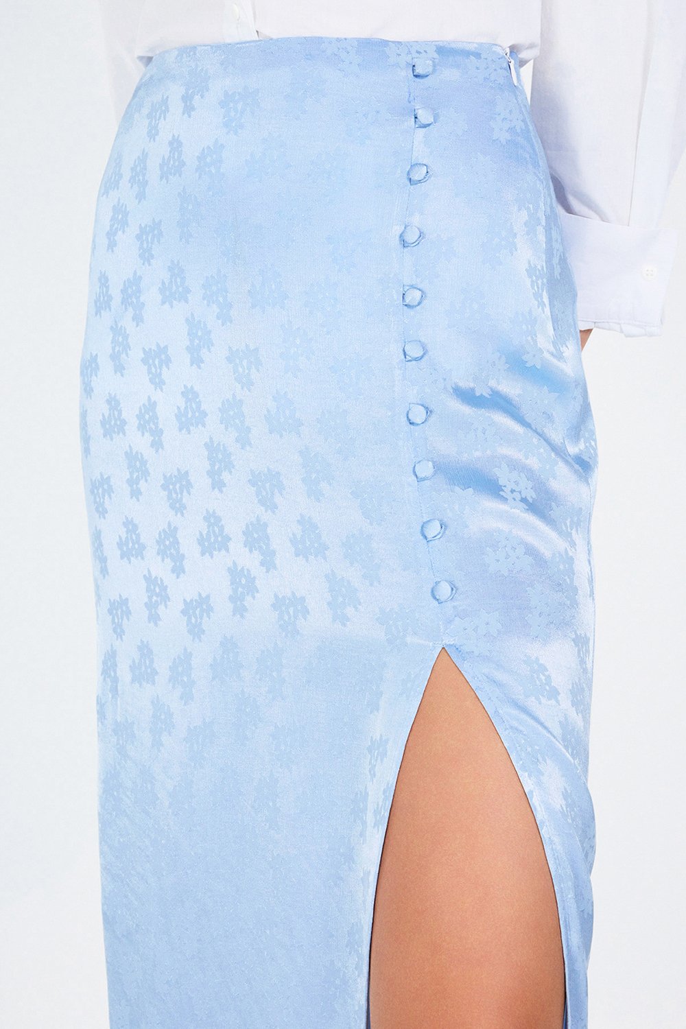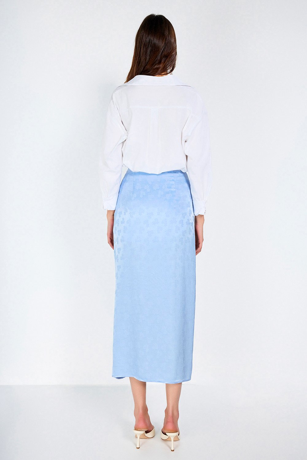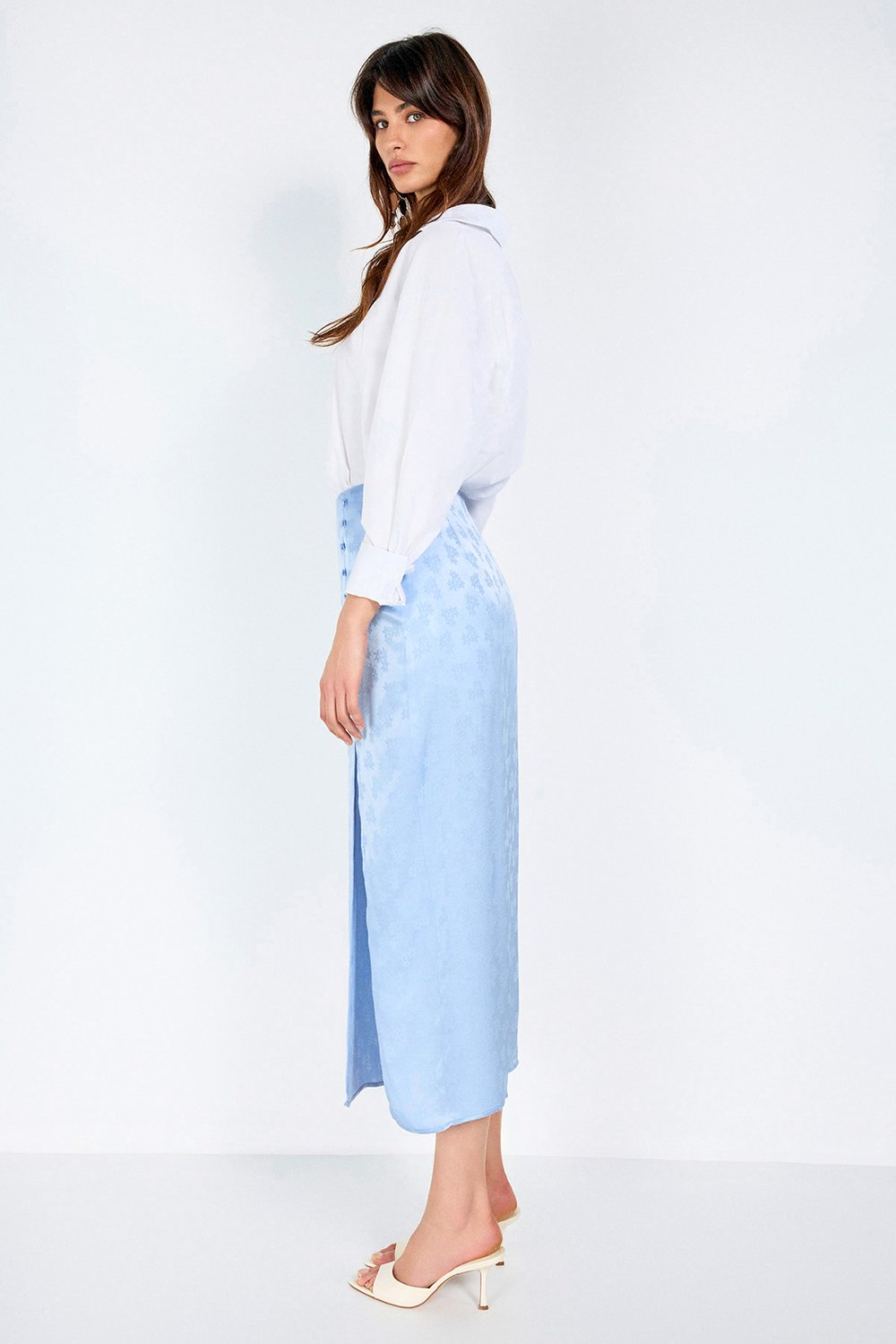 Jakarlı Önden Düğme Detaylı Mavi Midi Etek