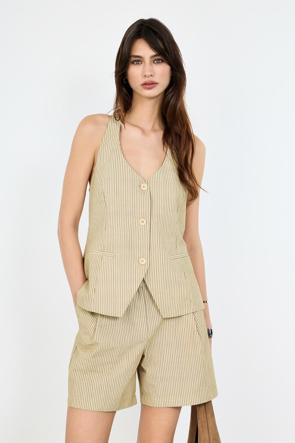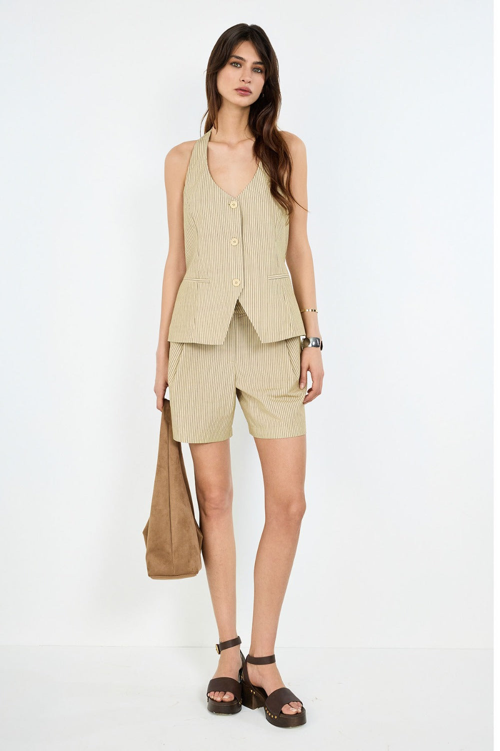 Günlük şıklıkla profesyonel görünümü bir araya getiren bu halter yaka yelek, keten karışımlı kumaşı sayesinde yaz ve bahar aylarında hafiflik sunarken, desenli kumaş kullanımı ve sırt detayı ile tasarıma sofistike bir hava katıyor.