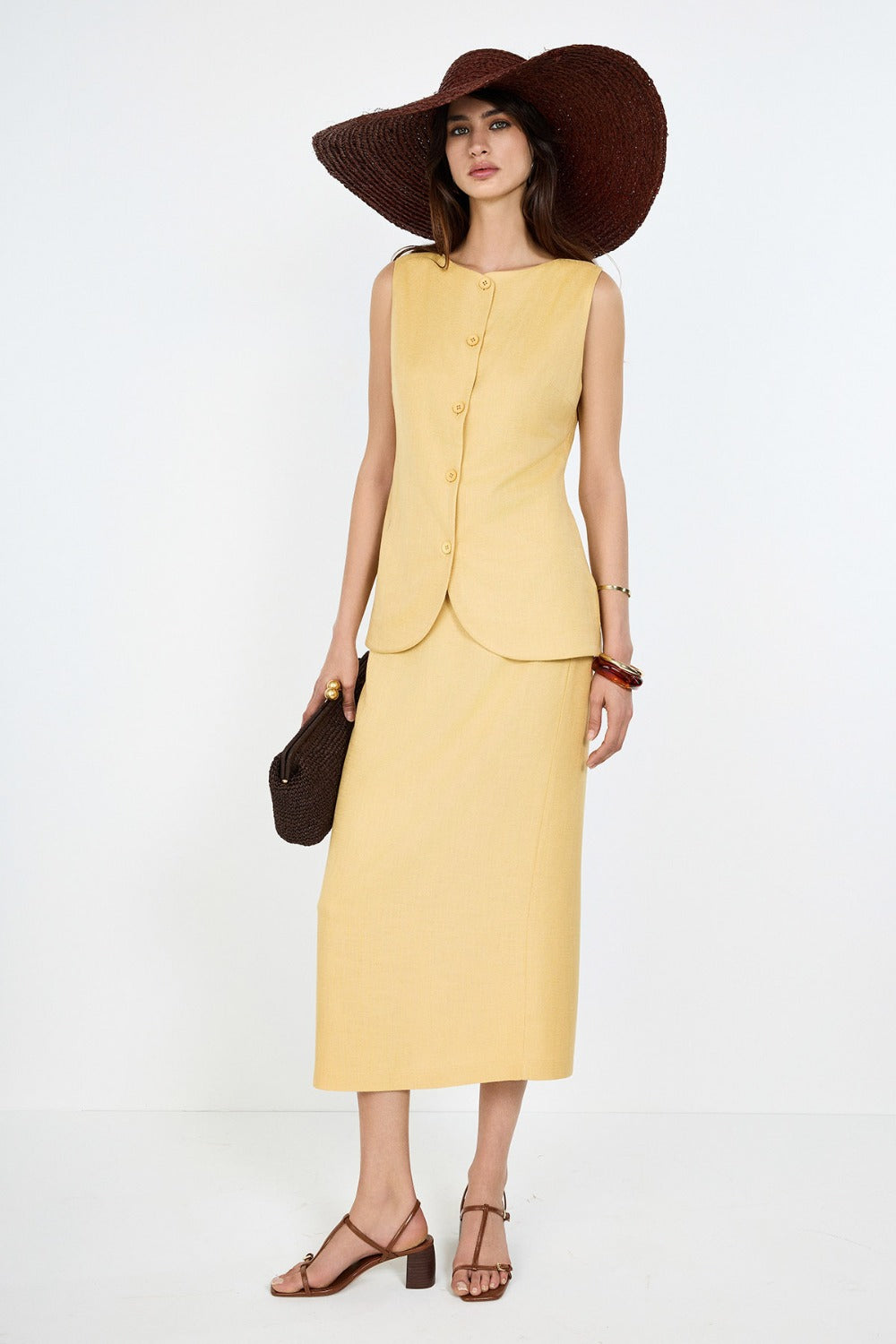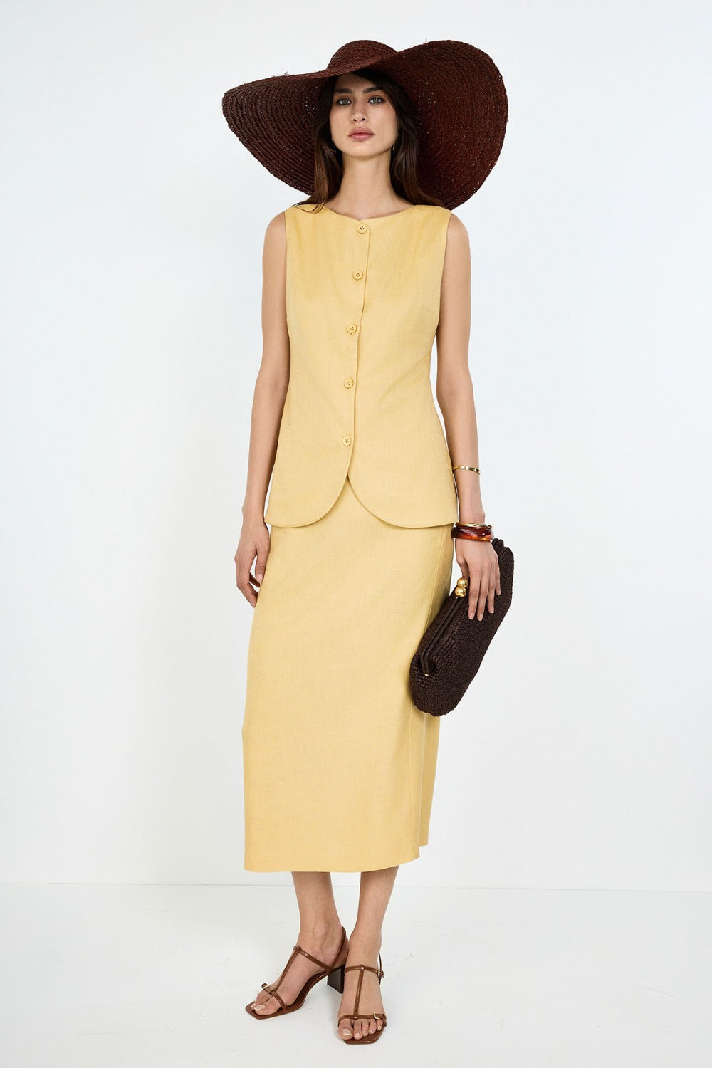 Vücuda oturan kesimi, önden pens detayları ve koleksiyonumuzdaki yeleklerle kombinlenmeye uygun tasarımı sayesinde, günlük şıklığı ve profesyonel görünümü bir araya getirir. Sezonun en trend sarı tonu ile tasarlanan bu parça hem ofiste hem şehirde stil sahibi bir görünüm sunar.