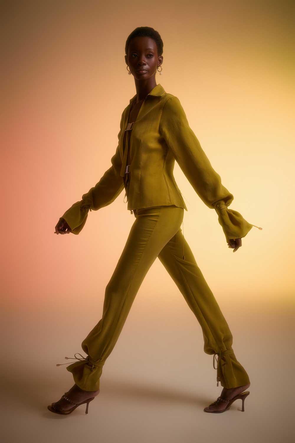 Harlem tarzı yeşil cupro pantolon. Bel ve bileklerde bağcık detaylı.