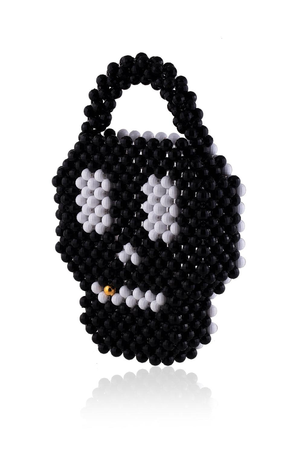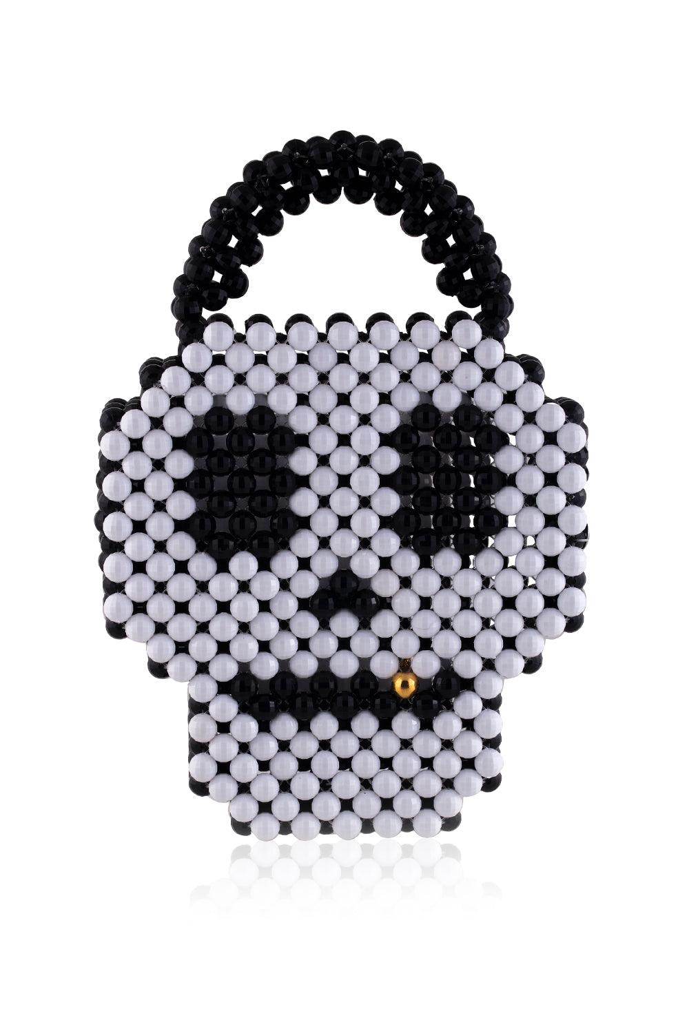 Siyah, beyaz çift taraflı, gold detaylı kurukafa el çantası. Milimetrik boncukların 25+kg direnç kapasiteli misinayla örülmesiyle üretilmiştir.