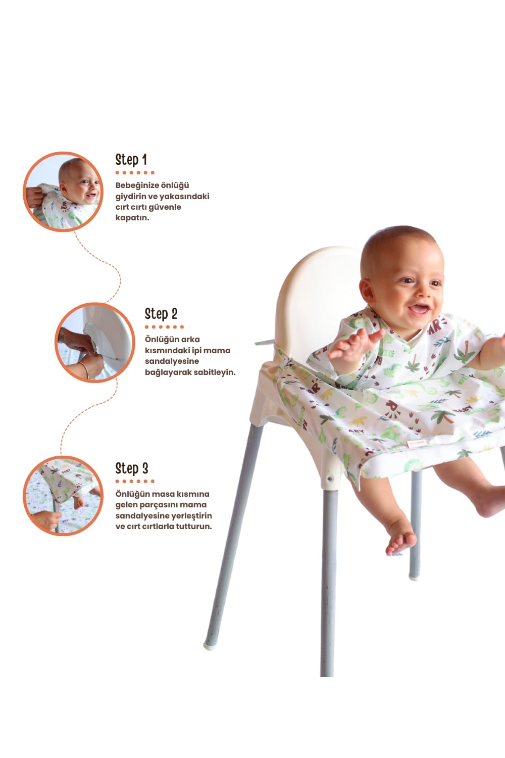 Mammam’ın özel olarak tasarlanmış su geçirmez bebek önlüğü, bebeklerin hem rahat hem de güvende olmasını sağlar. Her tip mama sandalyesine uyumlu olan bu önlük, 6-30 ay arası bebekler için ideal olup, yüksek kaliteli, suya dayanıklı malzemelerle üretilmiştir. Bebeğinizin kıyafetlerini yemek, içecek ve oyun esnasında temiz tutar. Özellikle mama sandalyesine kolayca monte edilebilen bu önlük, dışarıda hijyen konusunda endişe duyan anneler için mükemmel bir çözümdür.