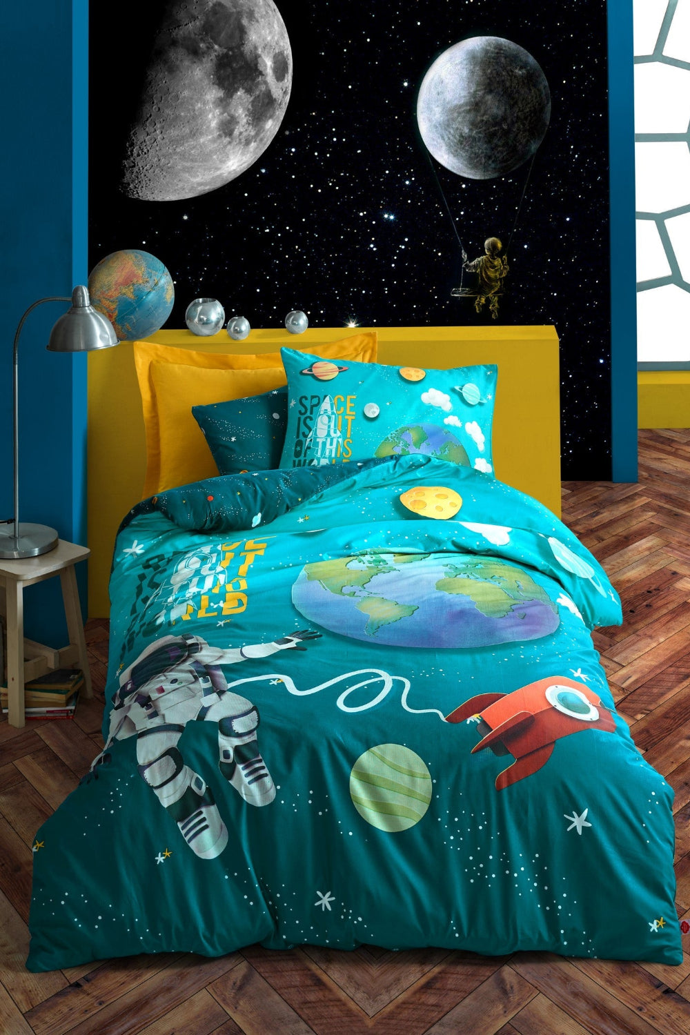 Junior Tek Kişilik Lastikli Çarşaflı Nevresim Takımı Little Astronaut Turkuaz