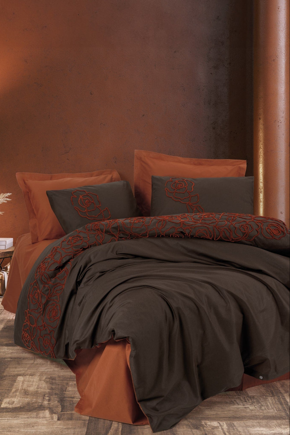 Nakışlı Ranforce Çift Kişilik Nevresim Takımı Rosen Kiremit