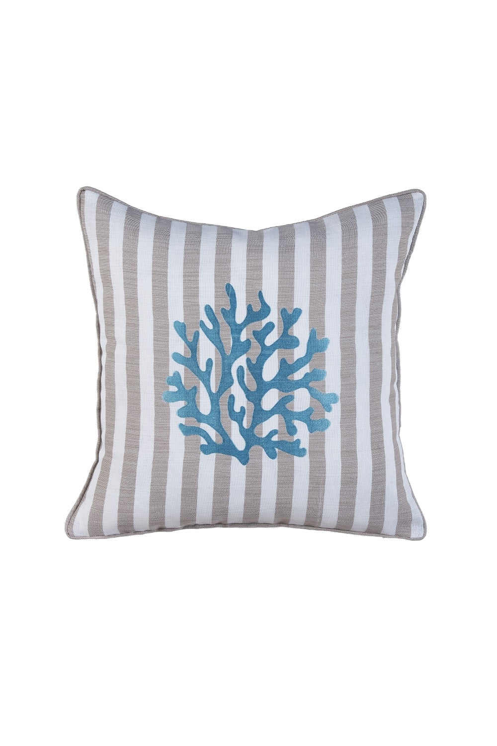 Ocean Serisi Turkuaz & Keten Çizgili Mercan Desenli Keten Kırlent