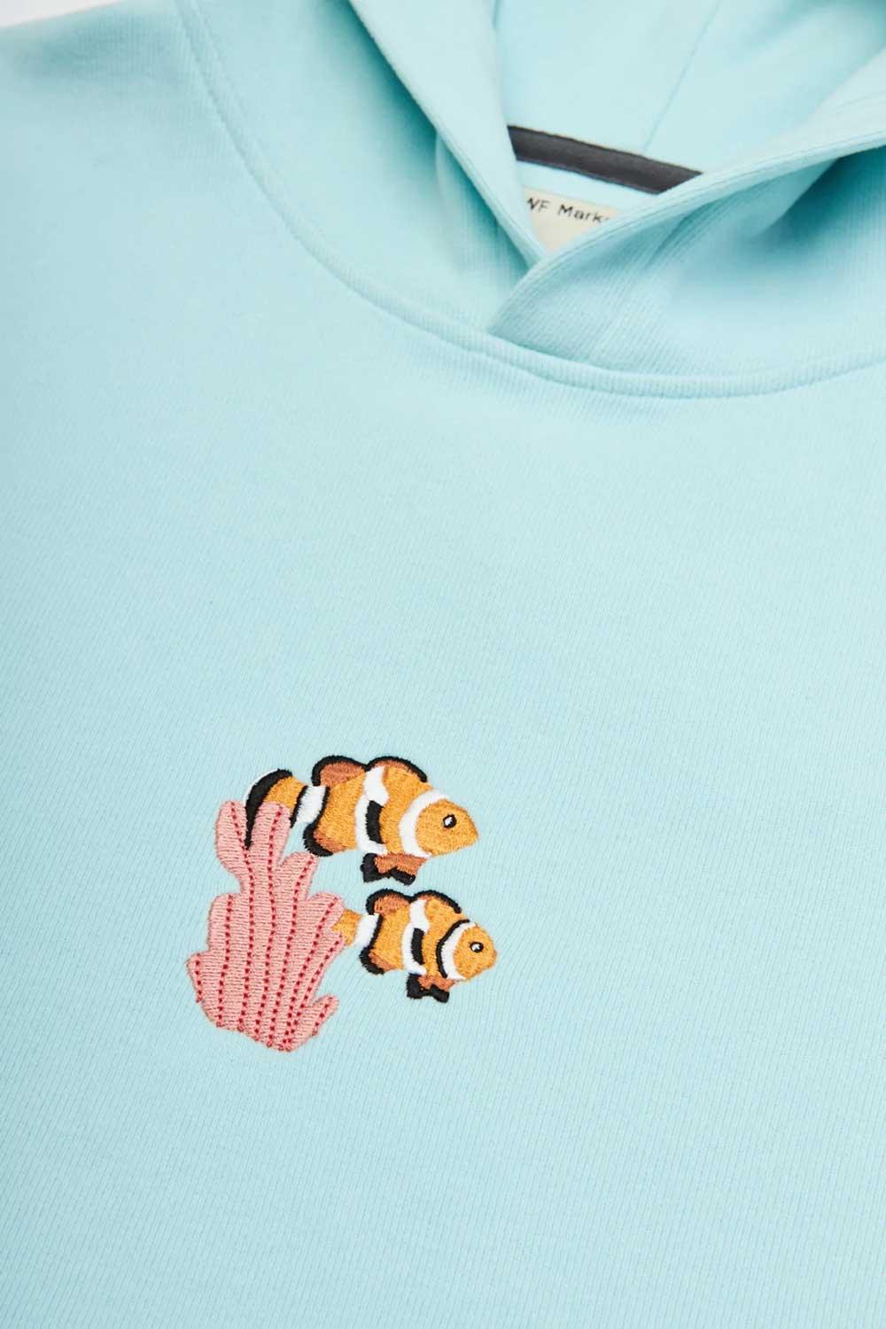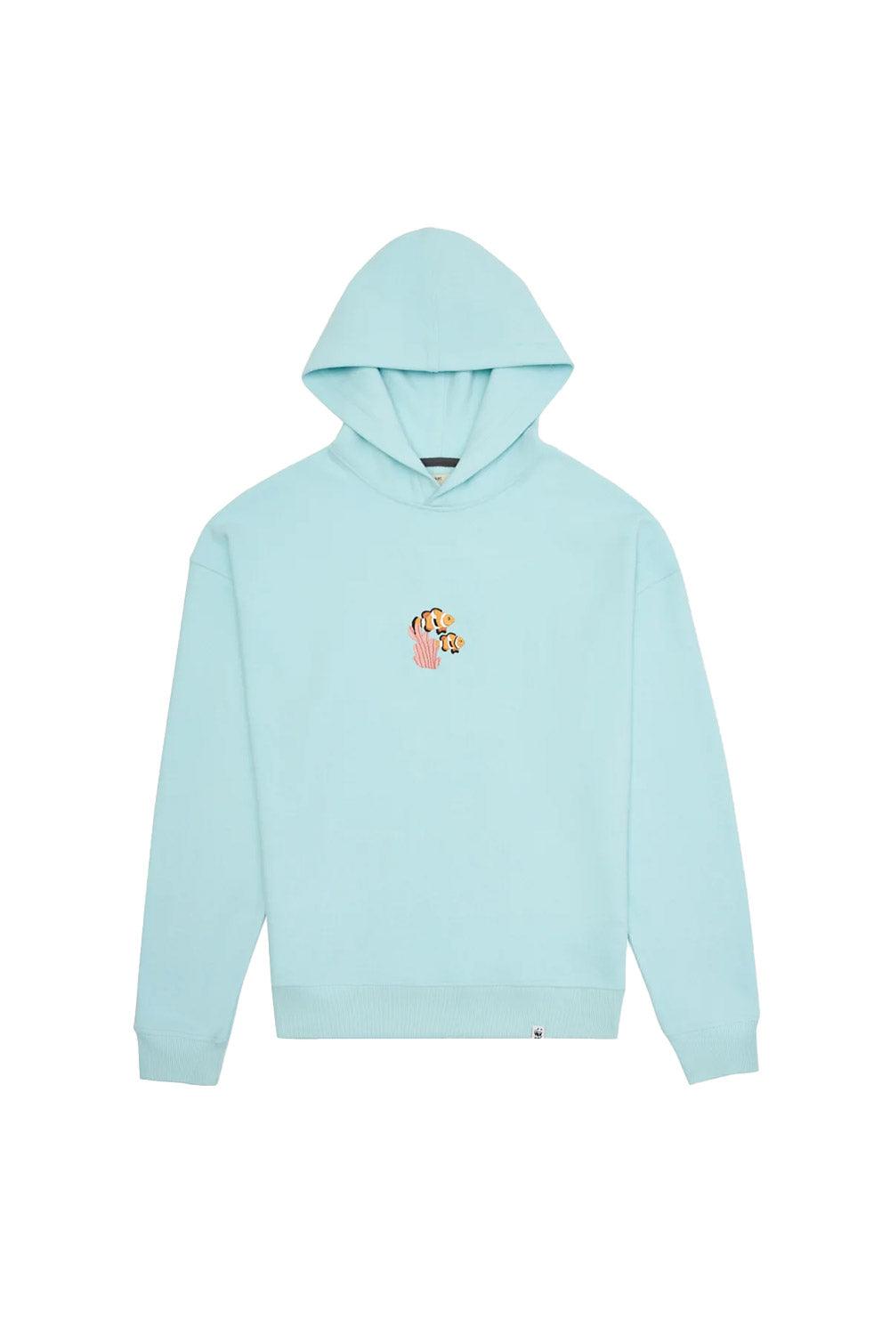GOTS sertifikalı pamuktan ve geri dönüştürülmüş polyesterden üretilen bu hoodie, beden üzerinde dökümlü durur. Unisex kalıpta ve geniş kesimlidir.