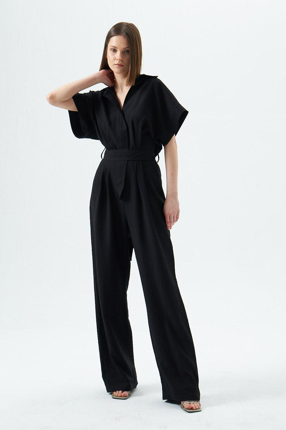 Gömlek yaka detaylı kısa kollu tulum. Rahat ve şıktır.