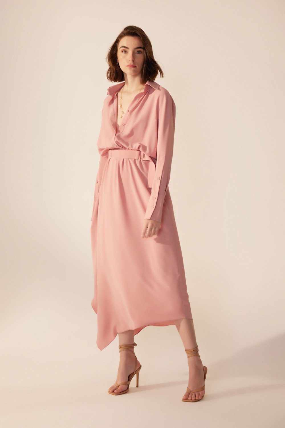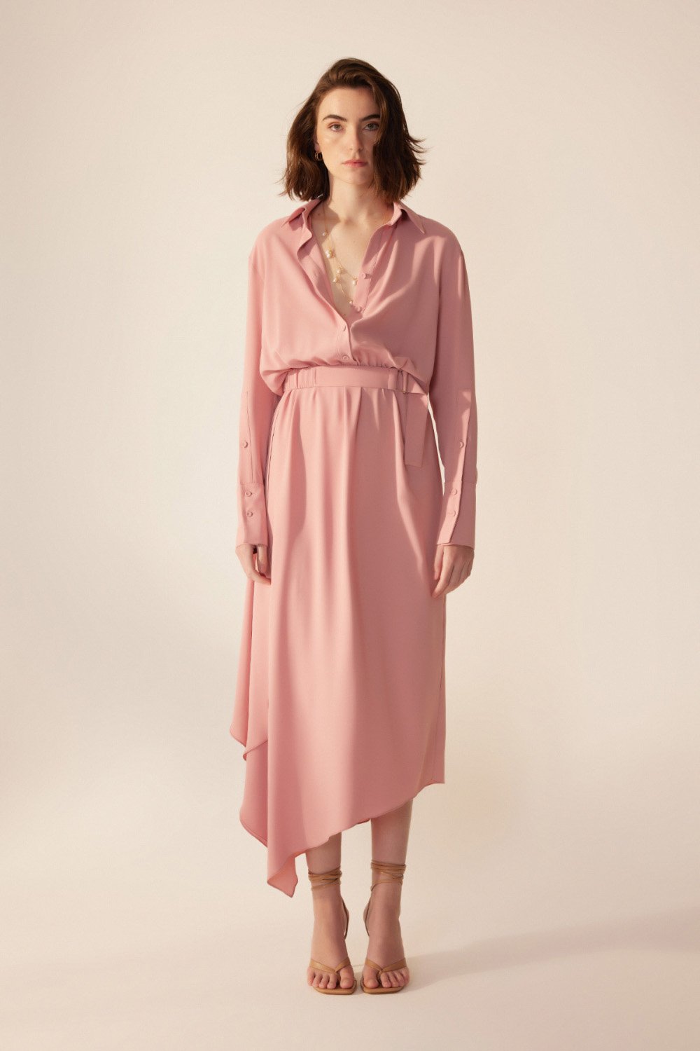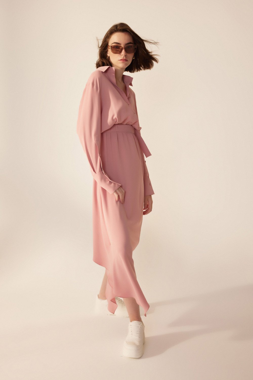 Asimetrik detaylı eteği olup, bel kısmı lastikli, ayarlanabilir ve tokalı kemer detayına sahip, yakalı, manşetli, önü patlı, üst kısmı gömlek formlu elbise.