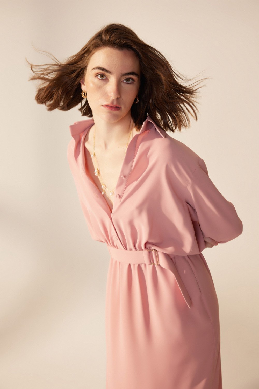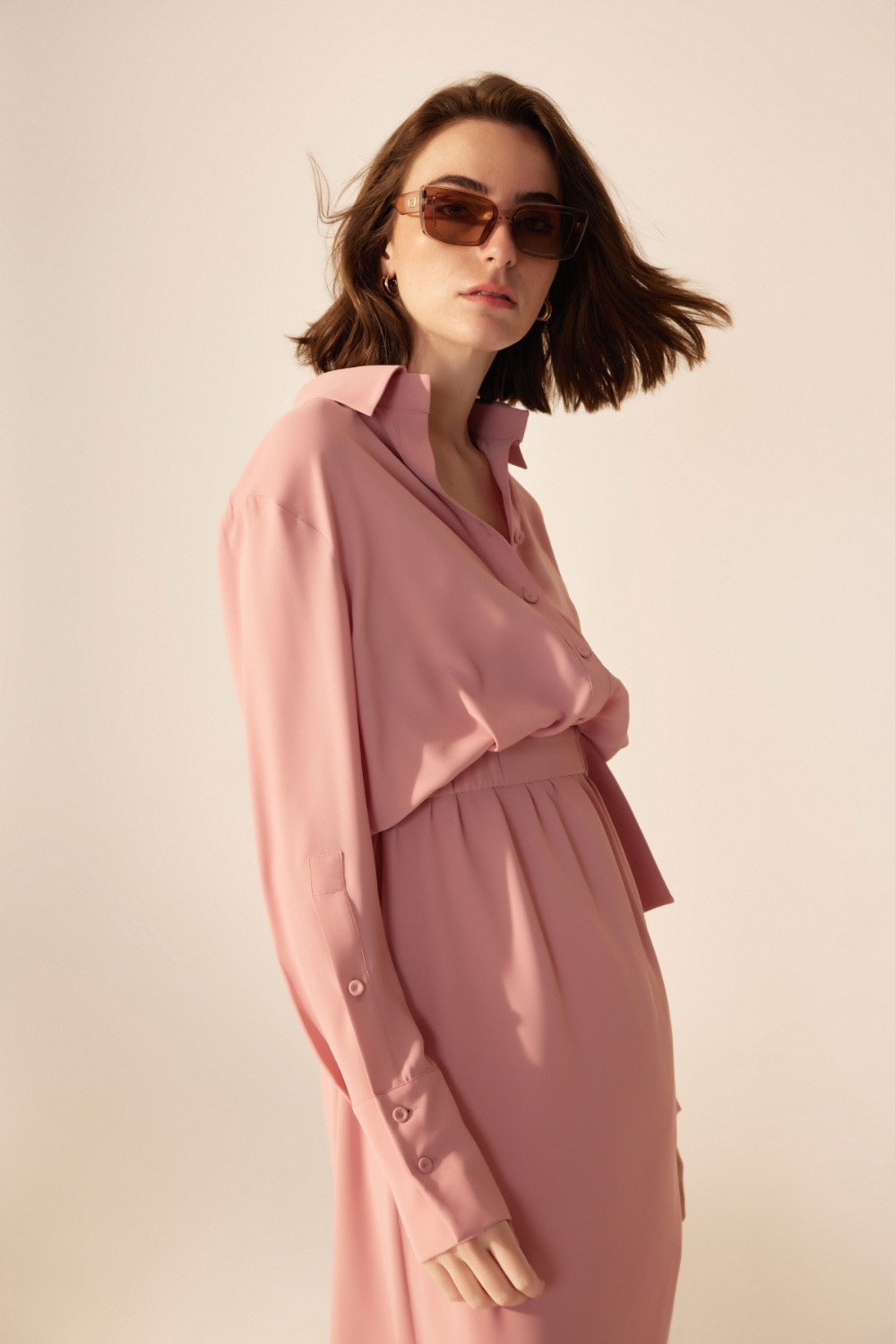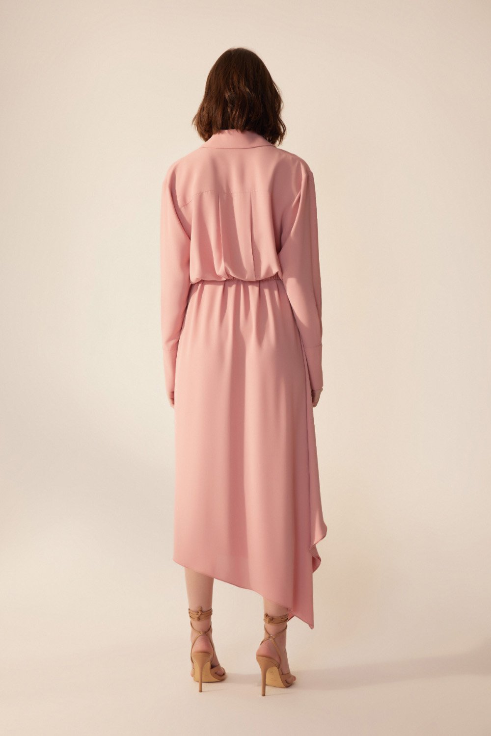 Asimetrik detaylı eteği olup, bel kısmı lastikli, ayarlanabilir ve tokalı kemer detayına sahip, yakalı, manşetli, önü patlı, üst kısmı gömlek formlu elbise.