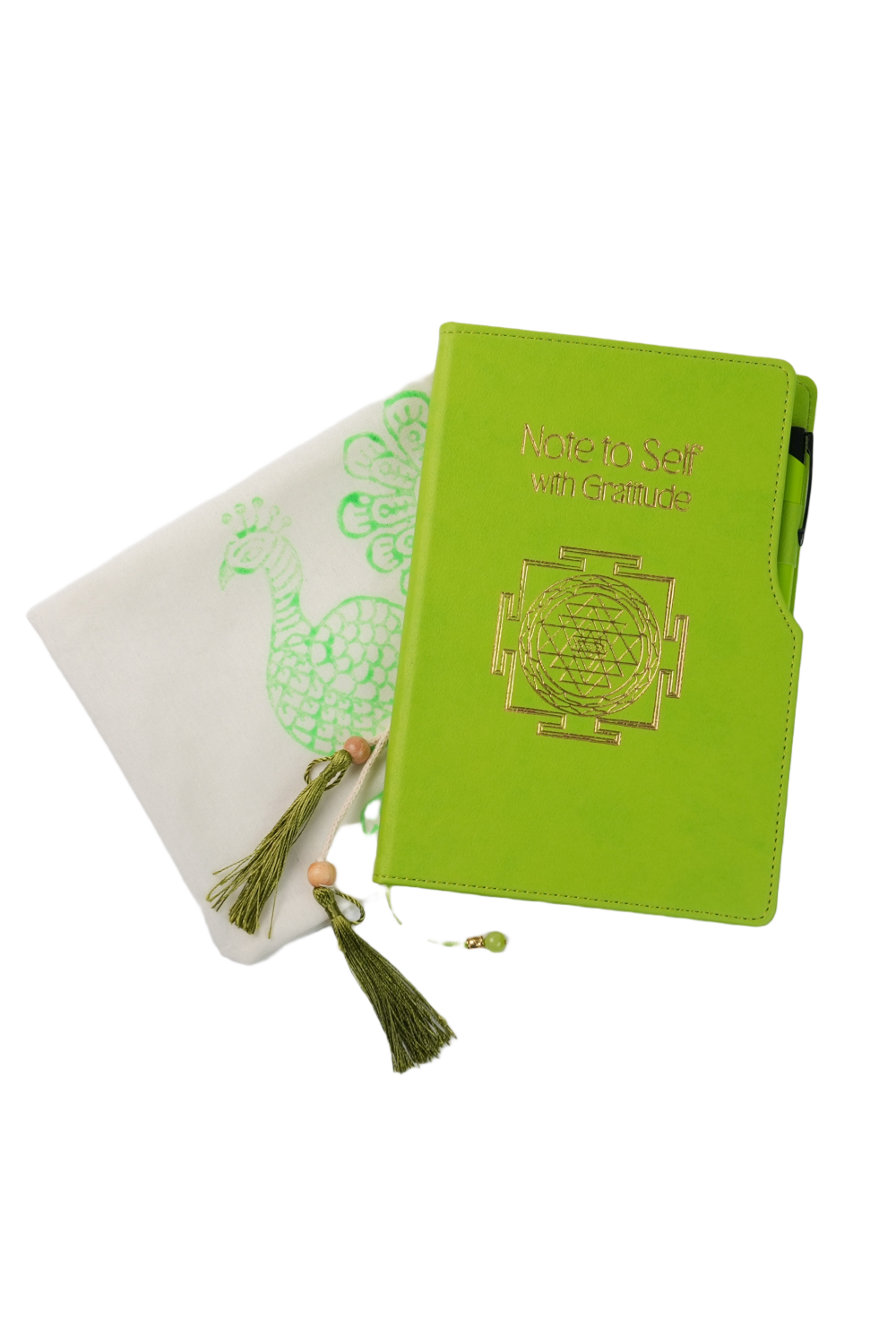 Do you feel that you are tossed like a leaf because you can’t find your life purpose? You are also tired of waking up to a new chaos every day, aren’t you? It would be nice if there was someone next to you now who would listen to you with unjudgmental tenderness. All these needs are very humanistic, but you don’t know where to start. New age trends are not viable either. Well, if I invite you to a routine consisting of questions that will be answered in the morning on 1 page and evening on the other page, starting with only 3 gratitute sentences. The questions are the same every day, but you will see that your answers are different every day with the flow of life, and looking back from time to time, seeing your progress will motivate you on this inspiring journey. Self to Note with Gratitute is made up of questions that will help you better manage your day while advancing you on your way to finding your life purpose and allow you to succeed in showing yourself the compassion you are looking for out there. We intend to transform your life with these question practices every day. All you have to do is answer the questions in the notebook. First Page is your swot analysis of yourself. Sri Yantra is on the cover of the notebook comes with a real, natural jade stone at the end of the separant rope, a pen next to it. Shipping is provided with a handmade pouch of green tasseled natural fabric with a wood print peacock image on it. If you specify it as a note, an elephant image can also be printed on the pouch. IS NOTE TO SELF with GRATITUTE has charm? Abundance frequency is studied with Mag Healy Resonance device. WHY IS THERE A SRI YANTRA ON THE COVER? The Sri yantra image is said to help people create their own reality by moving them to a high level of consciousness. WHY WAS JADE STONE USED? While providing emotional balance and stability, it can increase mental clarity and strengthen the immune system. WHY IS THERE A PEACOCK IN THE POUCH OF THE NOTEBOOK? Because it represents love, compassion, beauty and peace. Hayat amacınızı bulamadığınız için bir yaprak gibi savrulduğunuzu mu hissediyorsunuz? Her gün yeni bir kaosa uyanmaktan da bıktınız değil mi? Şimdi yanınızda sizi yargısızca şefkatle dinleyecek biri olsaydı ne iyi olurdu. Tüm bu ihtiyaçlar çok insani ama nereden başlayacağınızı bilemiyorsunuz. New age akımları da uygulanabilir gelmiyor. Peki, sizi sadece 3 şükür cümlesiyle başlayan, 1 sayfasında sabah ve diğer sayfasında akşam cevaplanacak sorulardan oluşan bir rutine davet etsem. Sorular her gün aynı ancak hayatın akışı ile birlikte her gün cevaplarınızın farklılaştığını göreceksiniz ve ara sıra geriye dönüp bakarak gelişiminizi görmek; sizi ilham verici bu yolculukta motive edecektir. Self to Note with Gratitute , hayat amacınızı bulma yolunda sizi ilerletirken, gününüzü daha iyi yönetmenize yardımcı olacak ve dışarıda aradığınız şefkati kendi kendinize göstermeyi başarmanızı sağlayacak sorulardan oluşturuldu. Her gün bu soru pratikleriyle hayatınızı dönüştürmeye niyet ediyoruz. Tek yapmanız gereken defterdeki soruları cevaplamak. İlk sayfada kendinizşn zayıf, güçlü, zorlayıcı ve fırsat olabilecek özelliklerinizi görebilmeniz için bir SWOT analizi sayfası hazırladım. Defterin kapağında Sri Yantra sembolü, ayıraç ipinin ucunda gerçek, doğal jade taşı, yanında yeşil bir kalem ile birlikte gelmektedir. Üzerinde ahşap baskı tavus kuşu görseli olan yeşil püsküllü doğal kumaştan el yapımı bir kese ile gönderim sağlanmaktadır. Not olarak belirtirseniz keseye fil görseli baskısı da yapılabilir. KENDİME NOT DEFTER’İ TILSIMLI MI? Mag Healy Rezonans cihazı ile refah frekansı çalışıldığı için evet tılsımlı. NEDEN KAPAKTA SRİ YANTRA VAR? Sri yantra görselinin; kişileri yüksek bir bilinç seviyesine taşıyarak kendi gerçekliğini yaratmada yardımcı olduğu söylenir. NEDEN JADE TAŞ KULLANILDI? Duygusal denge ve istikrar sağlarken, zihinsel berraklığa arttırabilir, bağışıklık sistemini güçlendirir. NEDEN DEFTERİN KESESİNDE TAVUS KUŞU VAR? Sevgi, şefkat, güzellik ve barışı temsil ettiği için.