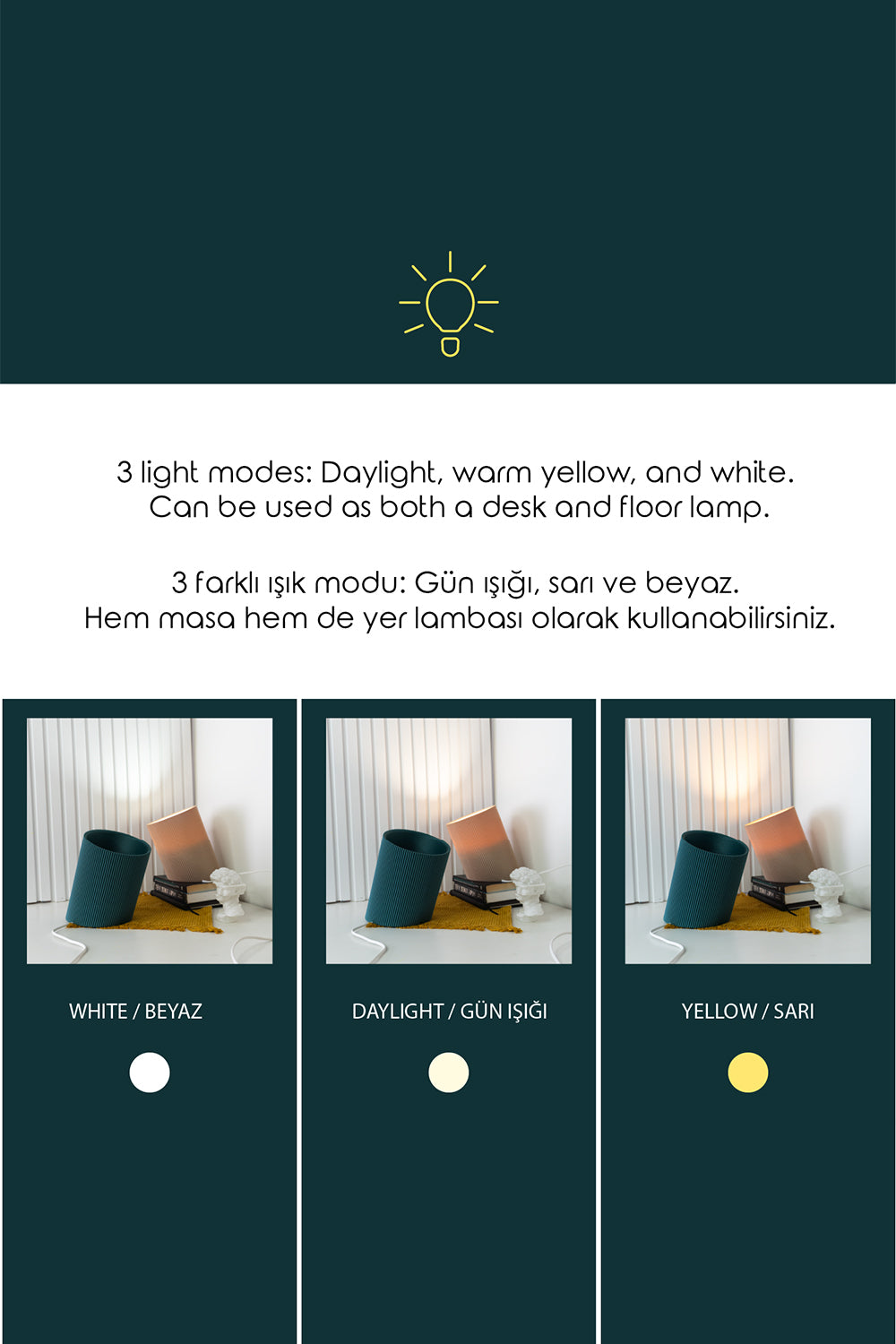 İçerisindeki üç farklı moda sahip LED ışık sayesinde beyaz, gün ışığı ve sarı ışık seçenekleriyle farklı atmosferler yaratmanıza imkan tanır. Evinizde, ofisinizde veya herhangi bir yaşam alanında hem işlevsel hem de dekoratif bir aydınlatma deneyimi sunar.