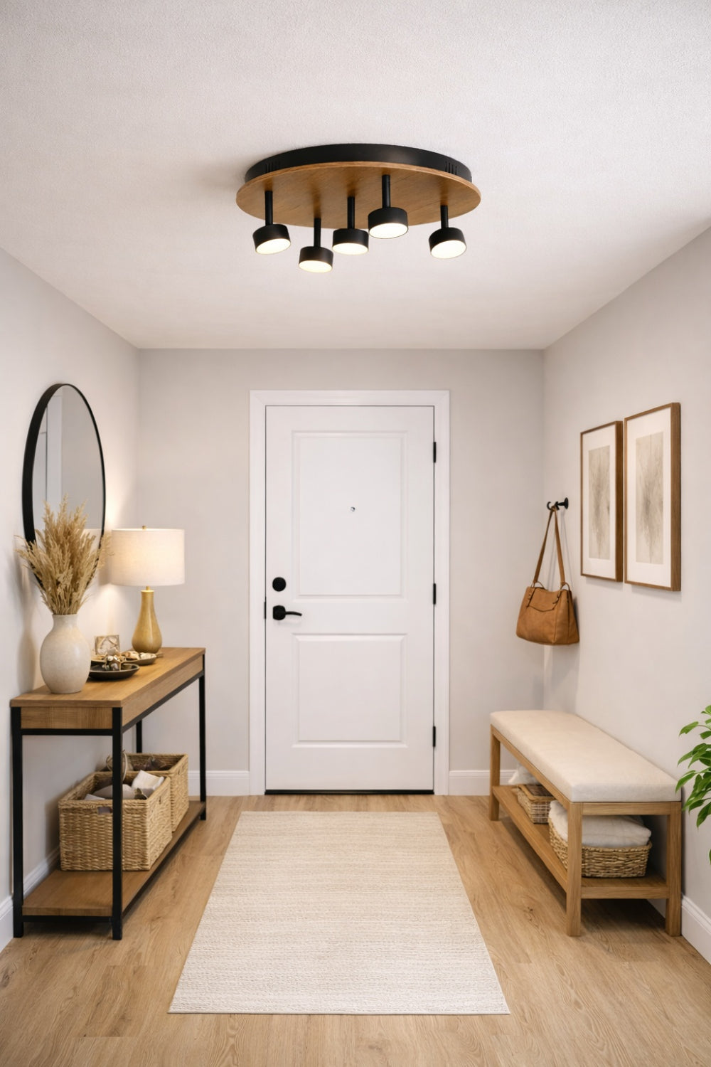 Plafonyer Spotlu Yuvarlak Ahşap Led Avize, Modern ve doğal tasarımı bir araya getiren 40 cm çapında yuvarlak ahşap plafonyer LED avize, yaşam alanlarınıza şık ve dengeli bir aydınlatma sunar. 5 adet ayarlanabilir spot başlığı sayesinde ışığı dilediğiniz yöne yönlendirebilir, hem dekoratif hem fonksiyonel bir kullanım elde edebilirsiniz. Ahşap görünümlü geniş gövdesi ve siyah metal detayları ile modern, minimal ve İskandinav tarz dekorasyonlara uyum sağlar.Kullanım AlanlarıAntre ve koridor, Mutfak, Salon, Oturma odası, Yatak odası alanlarında ideal aydınlatma sağlar. 40 cm çap ölçüsü sayesinde hem küçük hem orta büyüklükteki alanlar için dengeli ışık dağılımı sunar.Avantajları