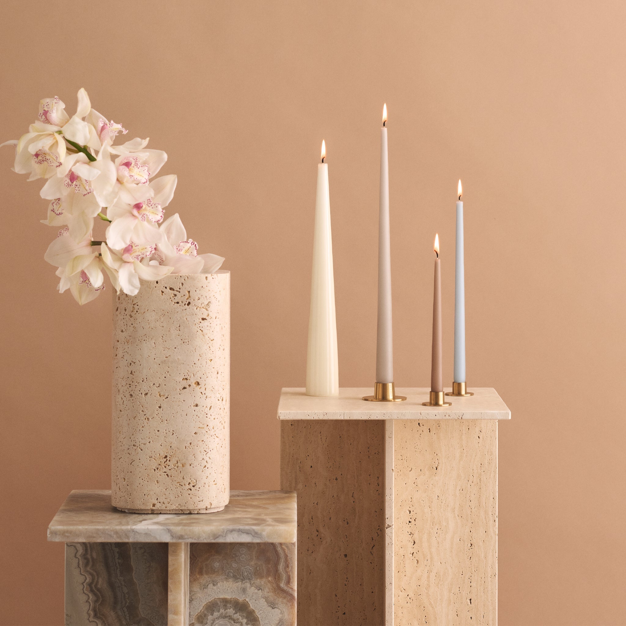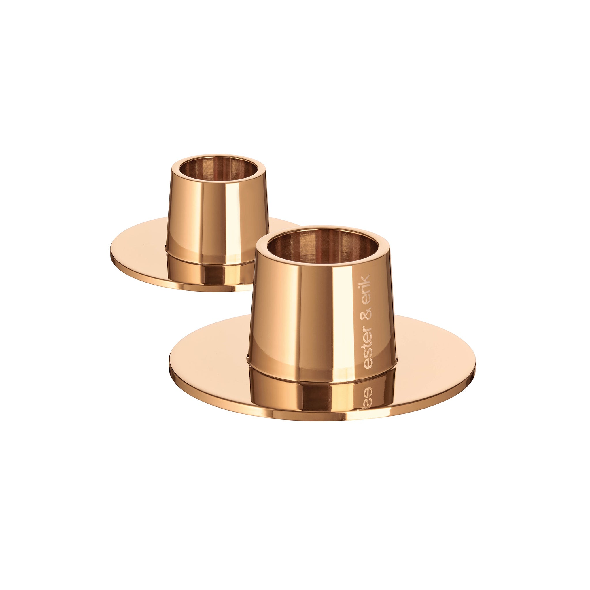 Erik tarafından, Ester ile gümüş evlilik yıldönümleri için tasarlanan klasik ve şık mumluk, zamanla en çok satan aksesuarlarımızdan biri haline geldi. Orta boy, konik mumlar için uygundur. Aksesuarlarımızda yüzey işlemi olarak PVD kaplama kullanıyoruz. PVD kaplama, metalleri kaplamak için çevre dostu bir yöntem olup, aynı zamanda kaliteyi ve yüzey bitişini artırır. Bu yöntem öncelikle üst segment saatlerde kullanılmıştır, ancak artık iç mekan ürünlerinde de bu ayrıcalıklı işlem uygulanabilmektedir.