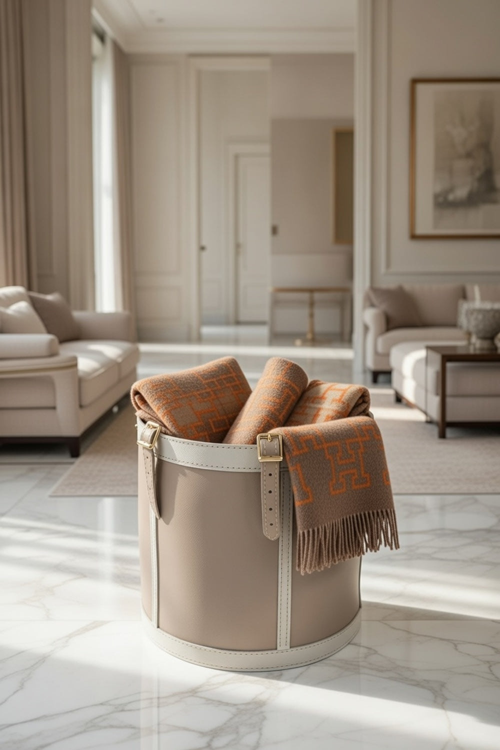 Zamansız tasarımı ve el işçiliği detaylarıyla öne çıkan bu yuvarlak deri sepet, yaşam alanlarına hem düzen hem de sofistike bir dokunuş kazandırmak için tasarlandı.