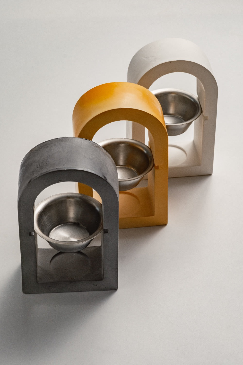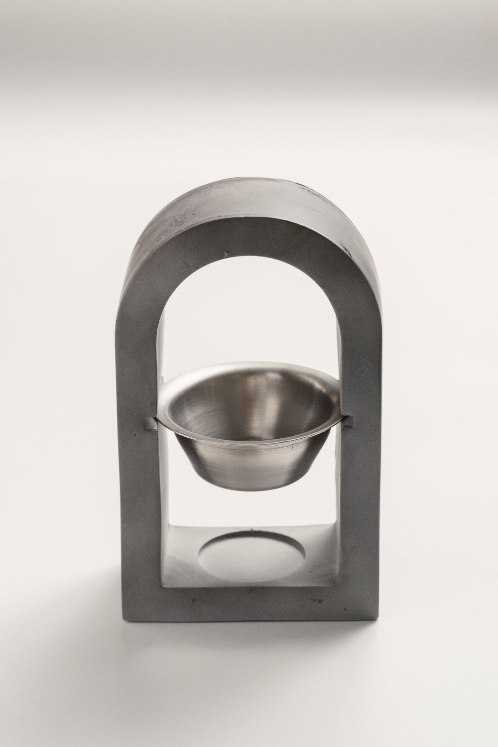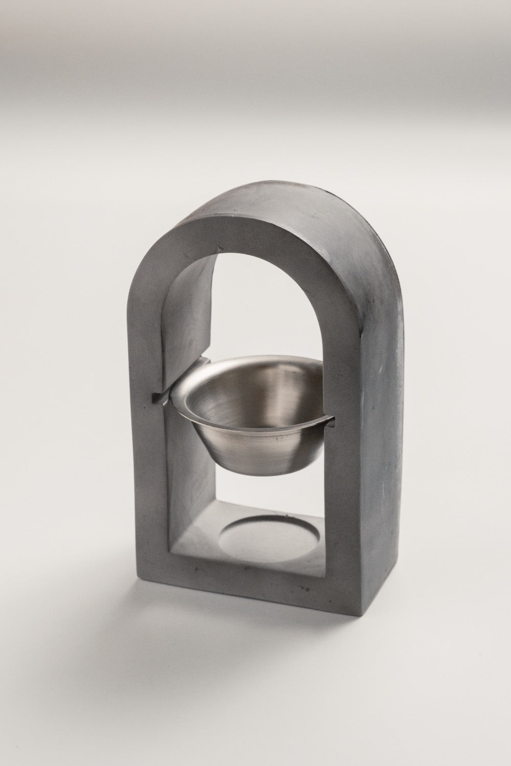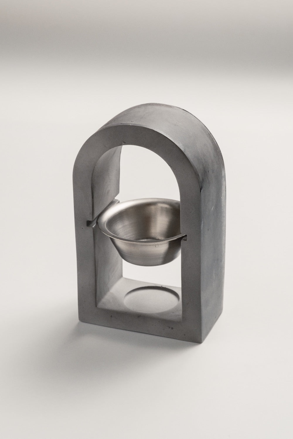 Bu modern buhurdanlık, doğal form ve işlevselliği bir araya getiriyor. Beton gövde içindeki metal kâse, uçucu yağları güvenli bir şekilde ısıtarak yaşam alanına hoş bir koku yayılmasını sağlar. Alttaki oyuk kısım tealight mum için tasarlanmıştır.