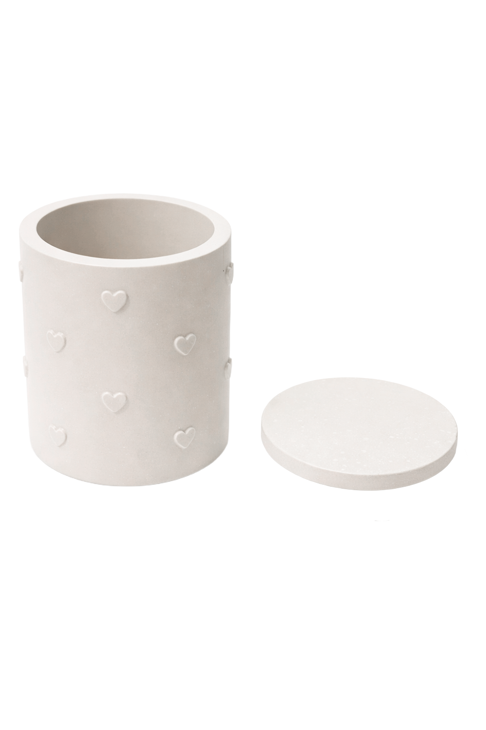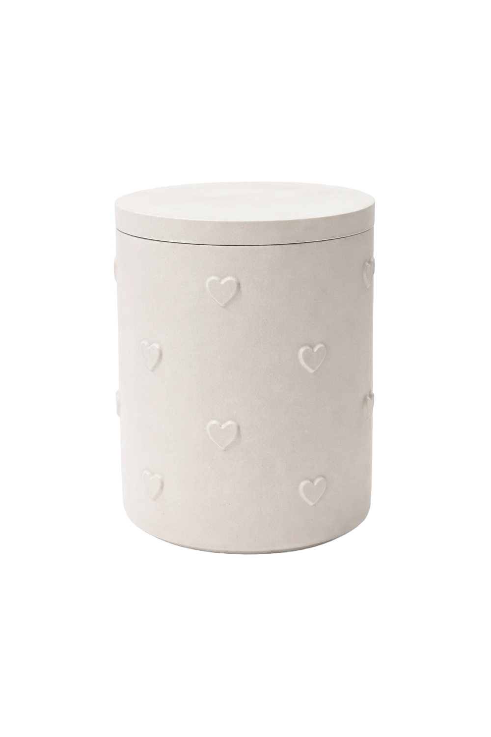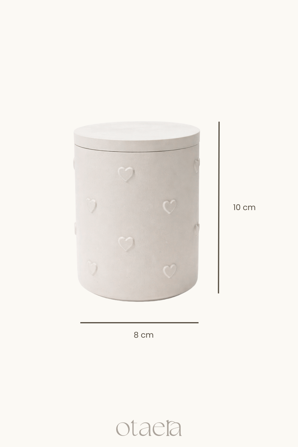 Kapaklı, silindirik saklama kutusuKabartma kalp motifli yüzeyEl yapımı üretimMat ve doğal dokuTakı, aksesuar ve dekoratif saklama amaçlı kullanımDekoratif kullanım için uygundur