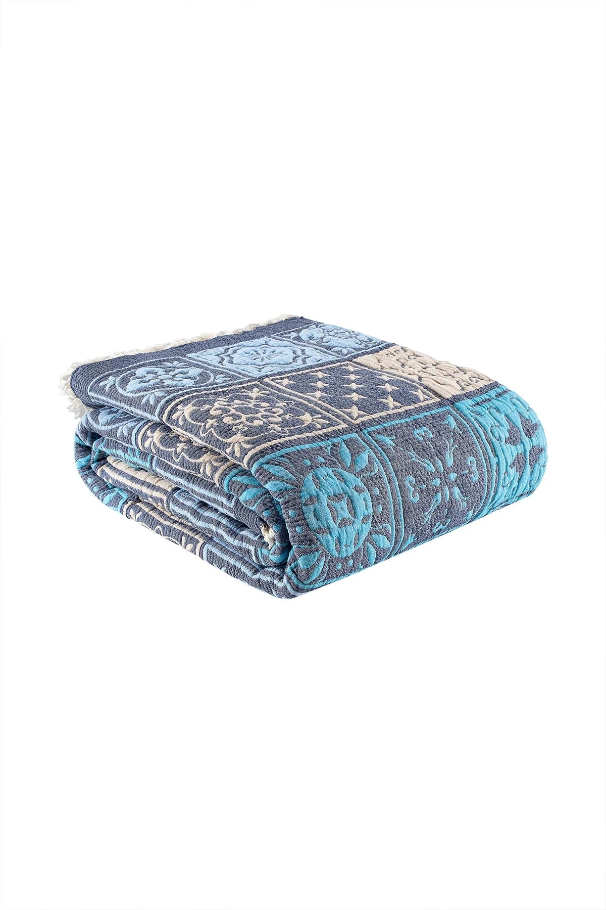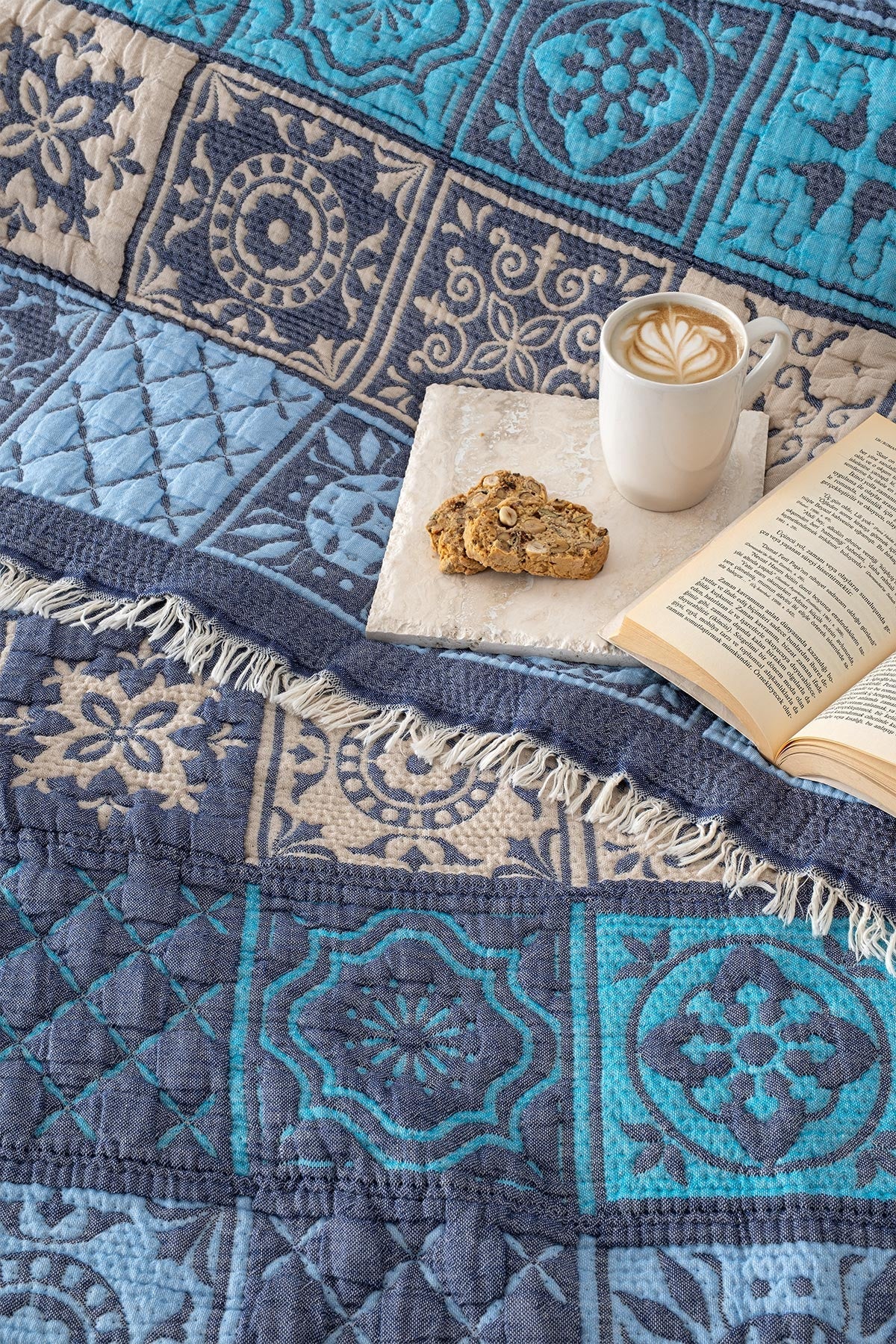 Patchwork Müslin Yorgan, alt ve üst yüzeyi ikişer kat %100 pamuk müslin kumaştan üretilmiştir. İç kısmında elyaf (polyester) dolgu bulunur. Toplamda 5 katlı yapısıyla kabarık dolgusu sayesinde konforlu bir uyku sunar. Nefes alabilen yapısı terlemeyi önler ve dört mevsim kullanılabilir. Mavinin tonlarının farklı desenlerle birleştiği bu tasarım, hem modern hem nostaljik bir görünüm sunar. Yatak örtüsü, battaniye ve yorgan olarak kullanılabilir. Çift taraflı dokusu sayesinde uzun ömürlüdür.