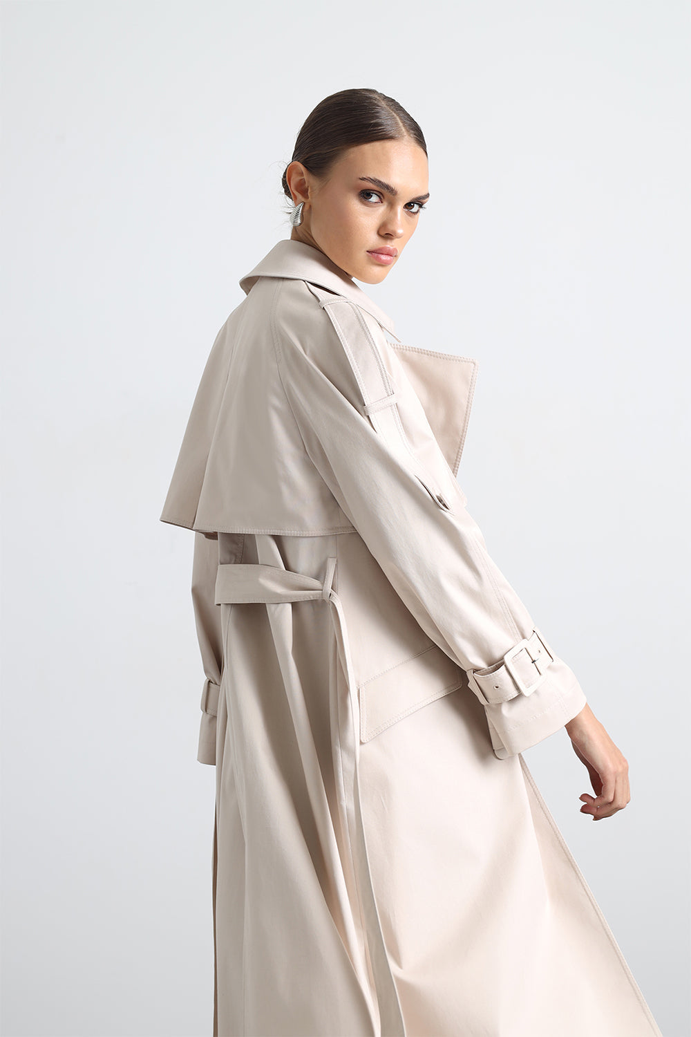 Savrin Bej Kuşaklı Apoletli Maxi Trençkot