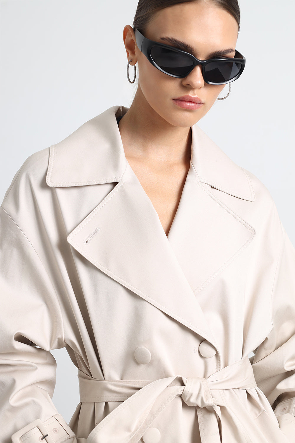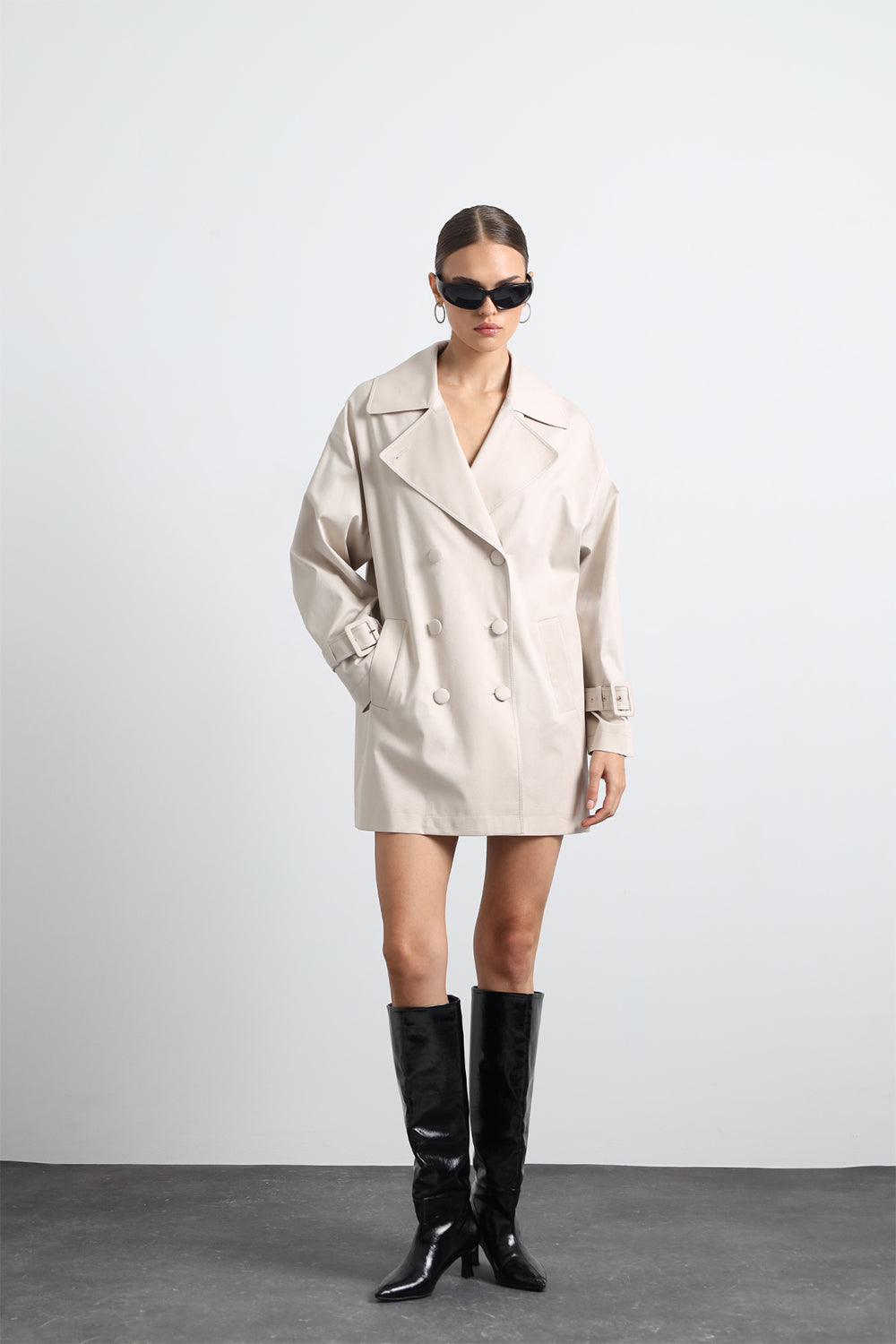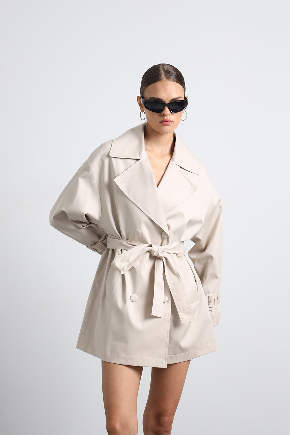 Serave Bej Mini Trençkot, hem günlük kullanımda hem de özel anlarda tarzınızı tamamlayan şık bir seçenek sunar.