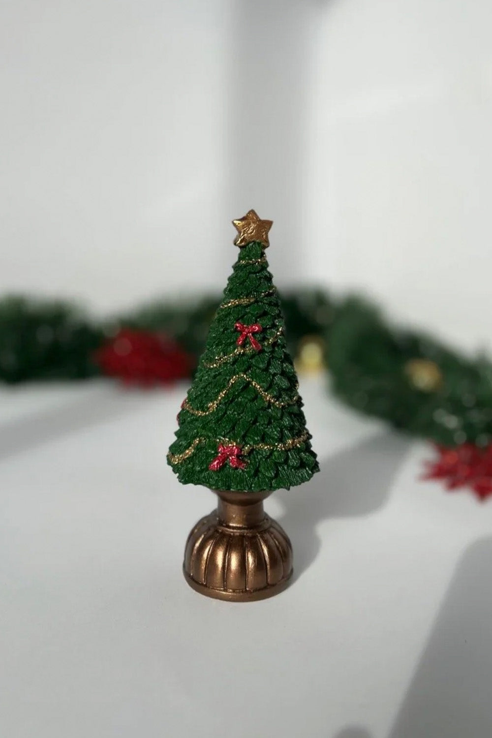 1. sınıf sağlam polyester objenin koyu yeşil rengine altın detaylar, renkli süslemeler eşlik ediyor.