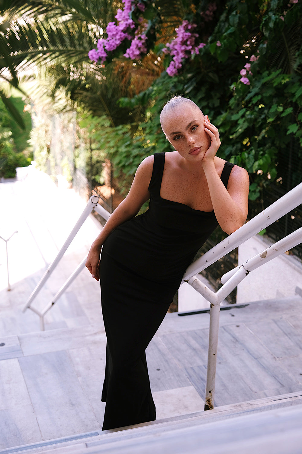 - Maxi boyu ile bacakları olduğundan daha uzun gösterirken askılı kol boyu omuzları serbest bırakarak feminenliği arttırır.