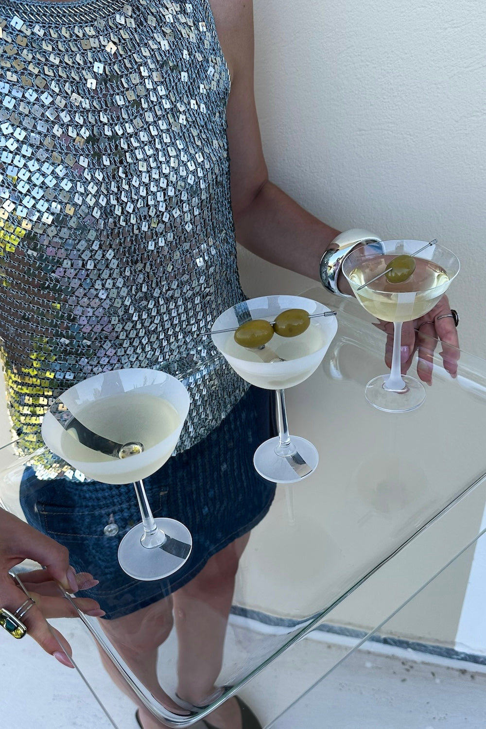 Scarpa glasses are made from lightweight crystal glass, specially sourced from the Czech Republic. They are shaped using a distinct sandblasting technique that gives them their unique surface texture.