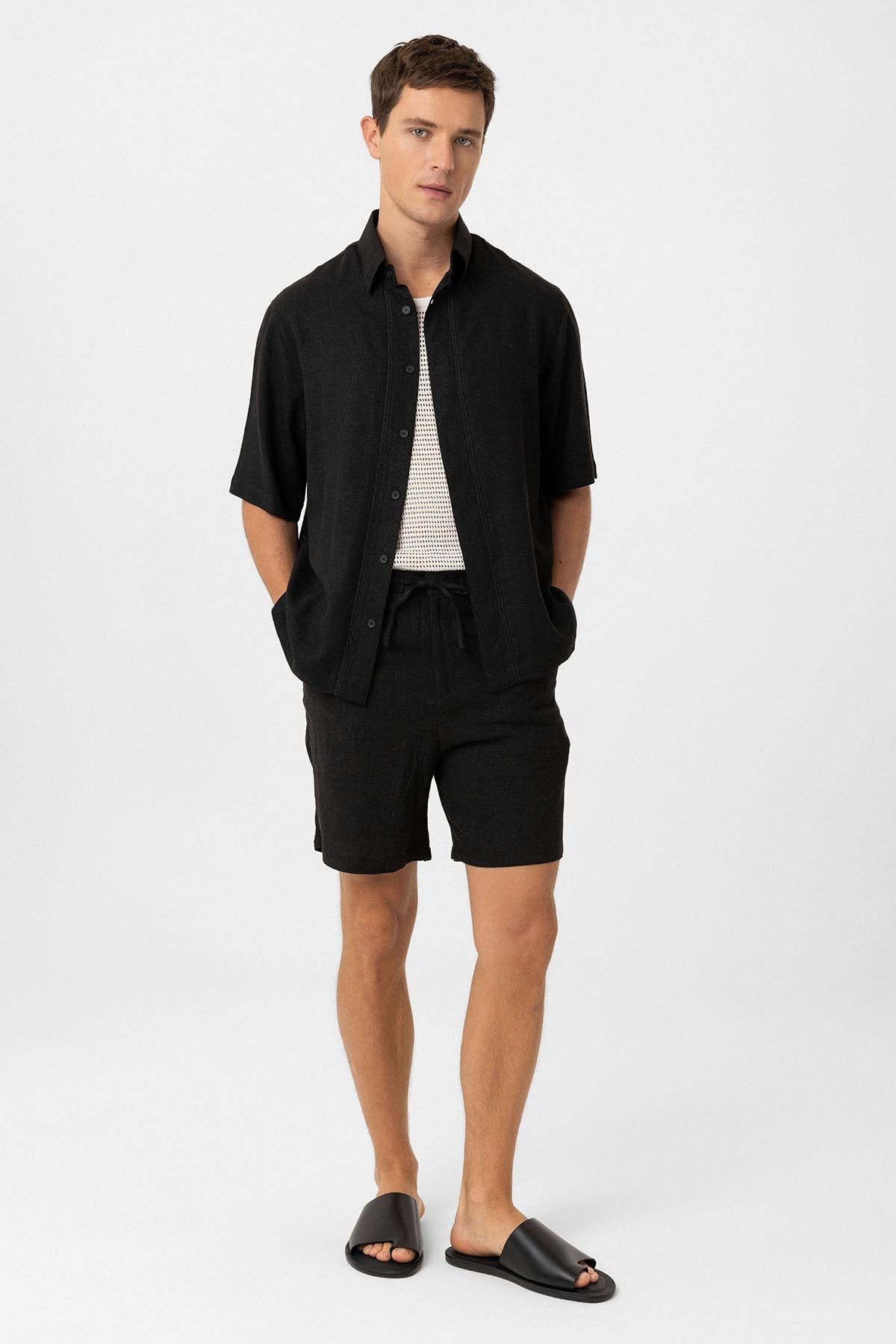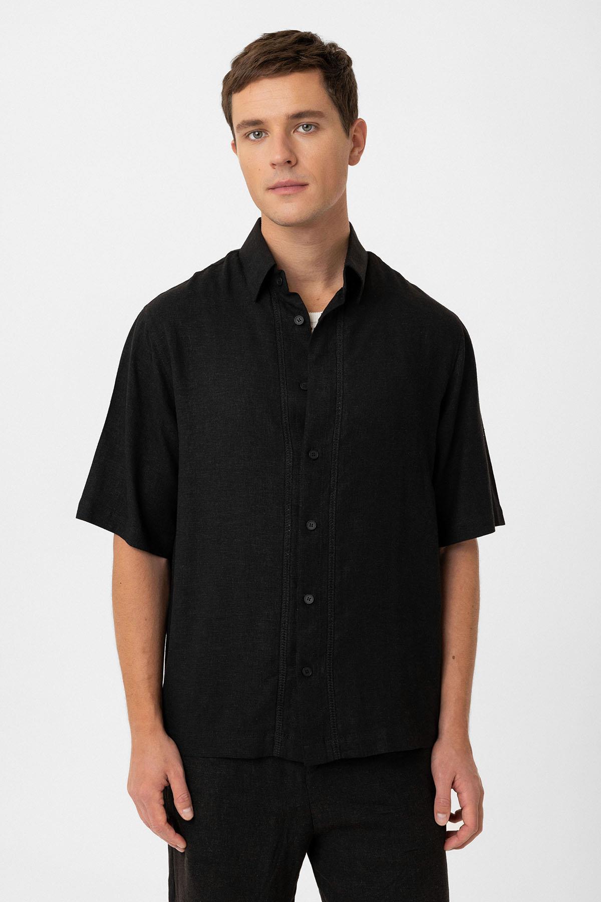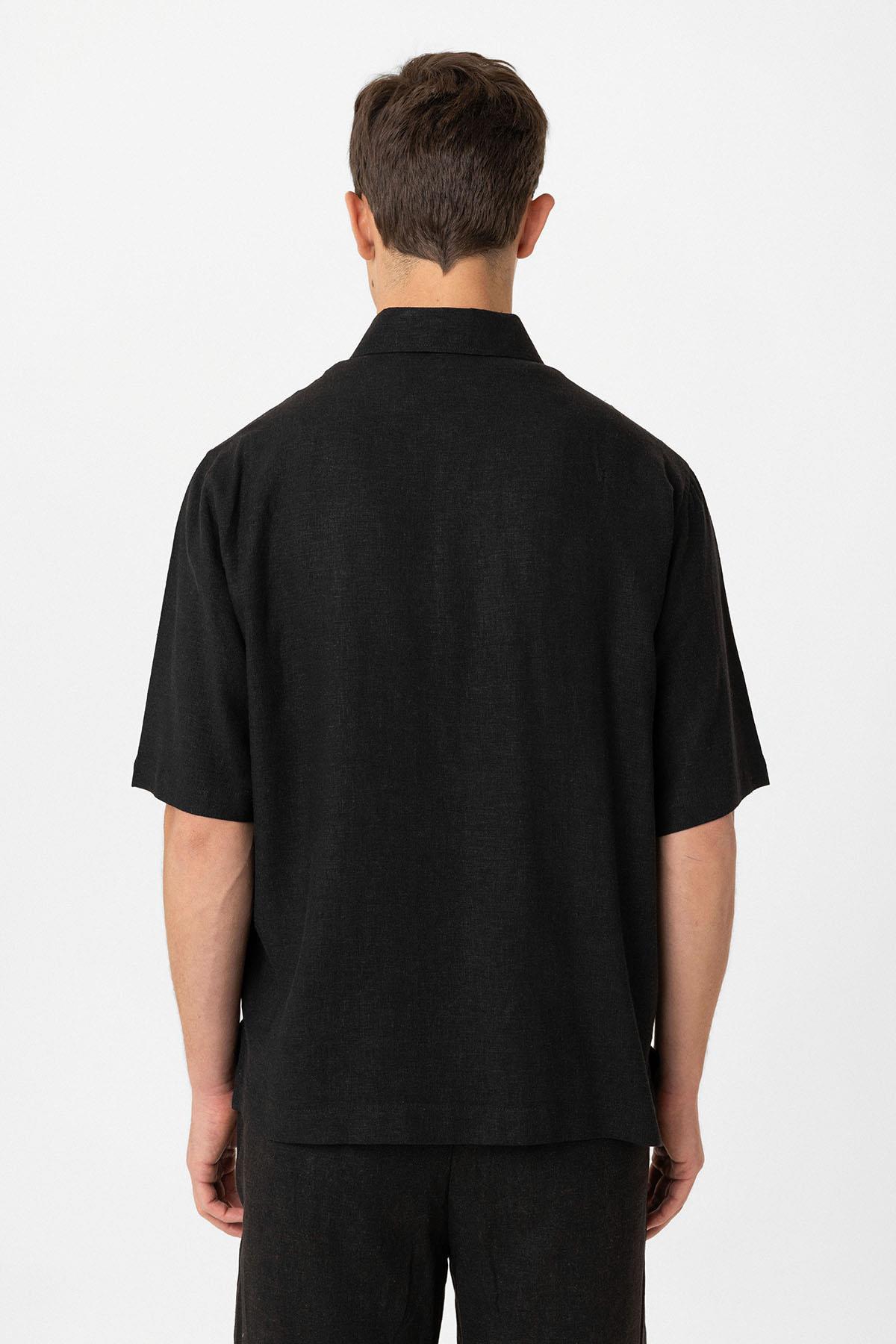Siyah Keten Karışımlı Relaxed Erkek Gömlek