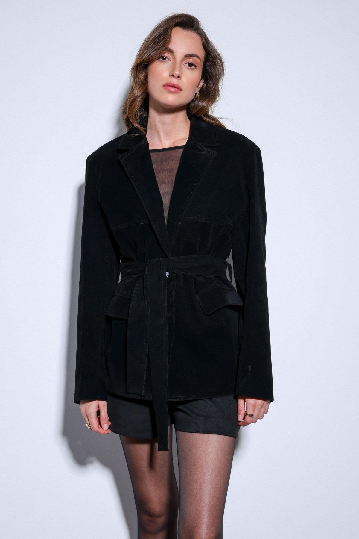 Siyah Kuşak Bağlamalı Süet Kadın Ceket