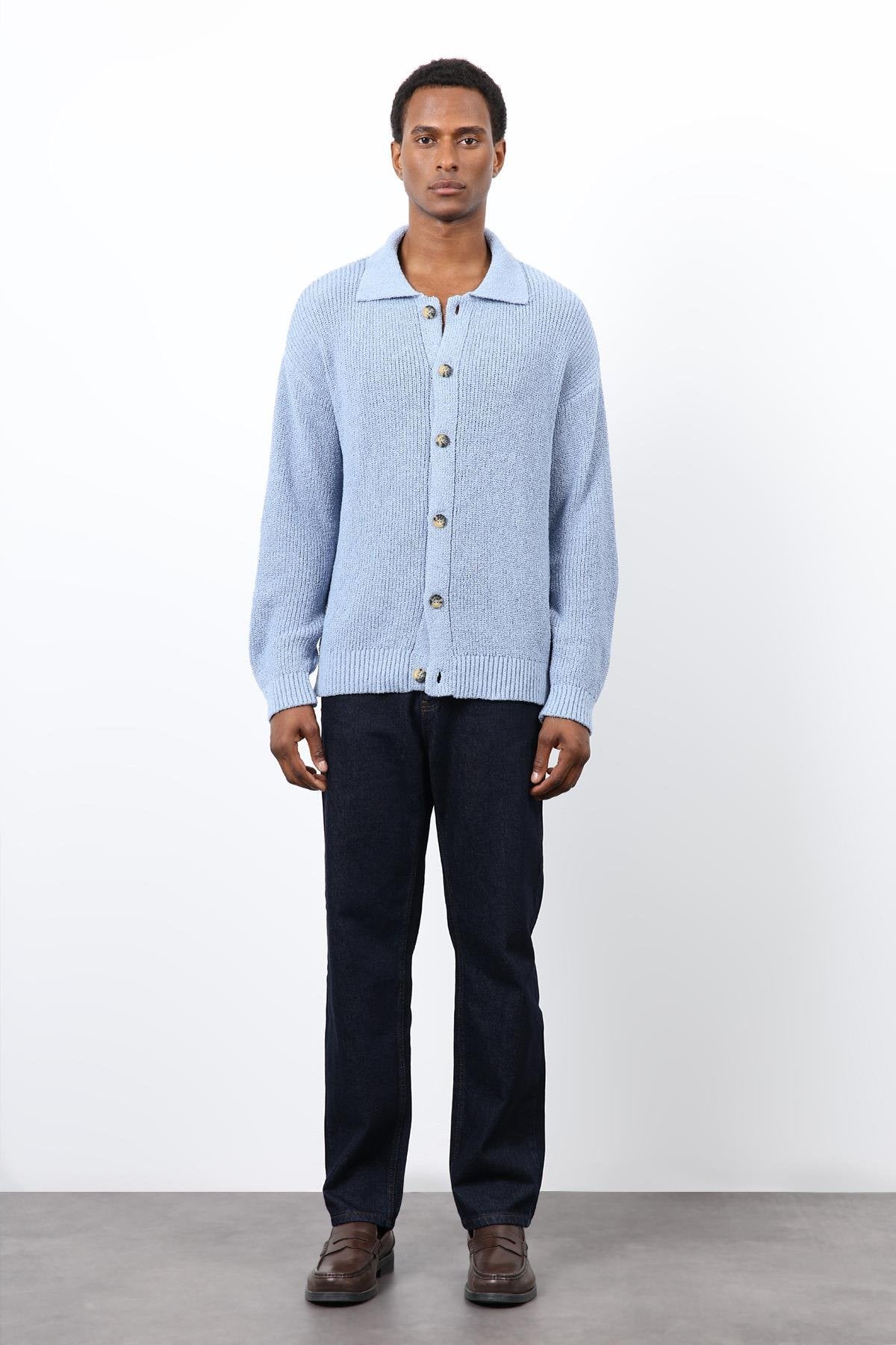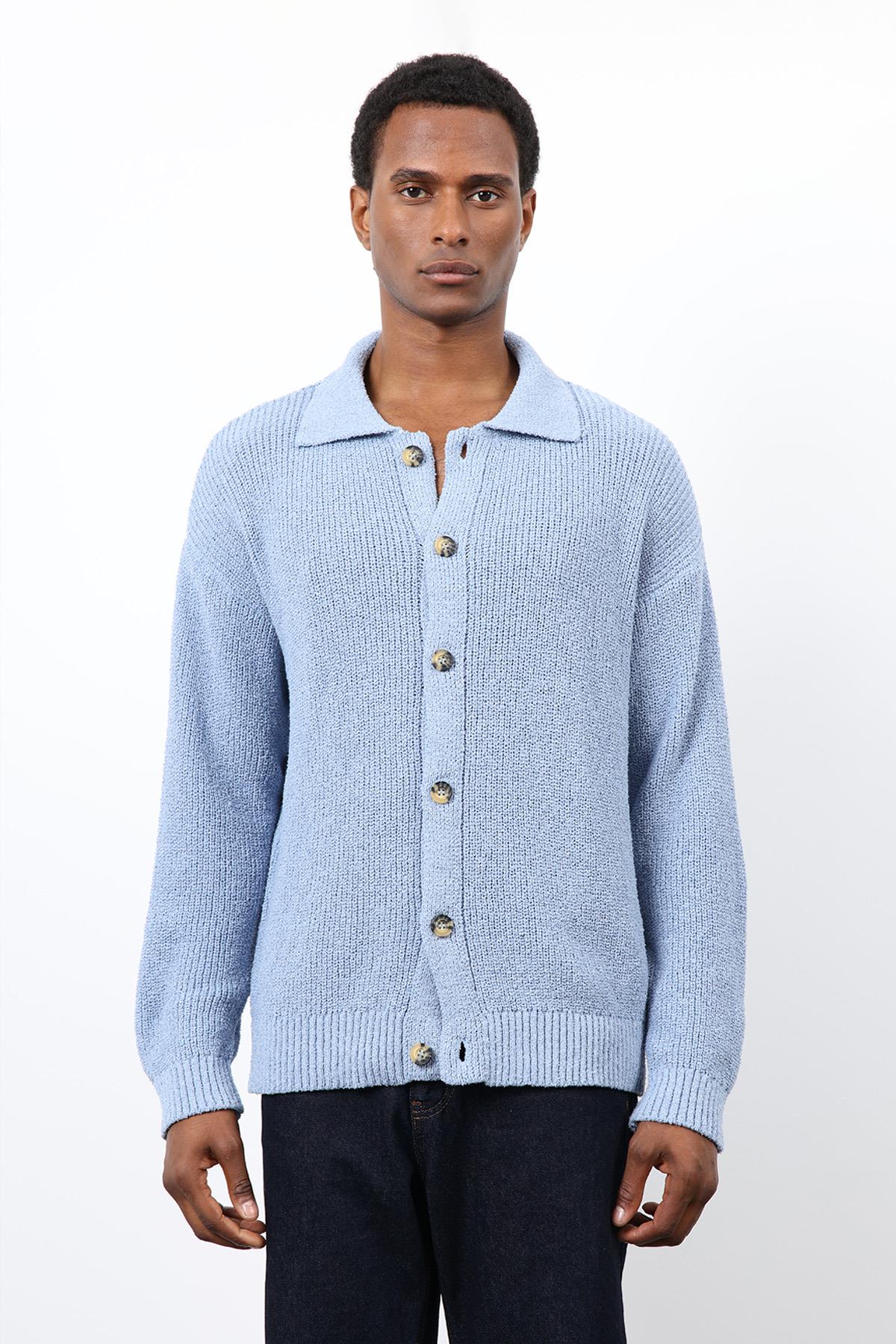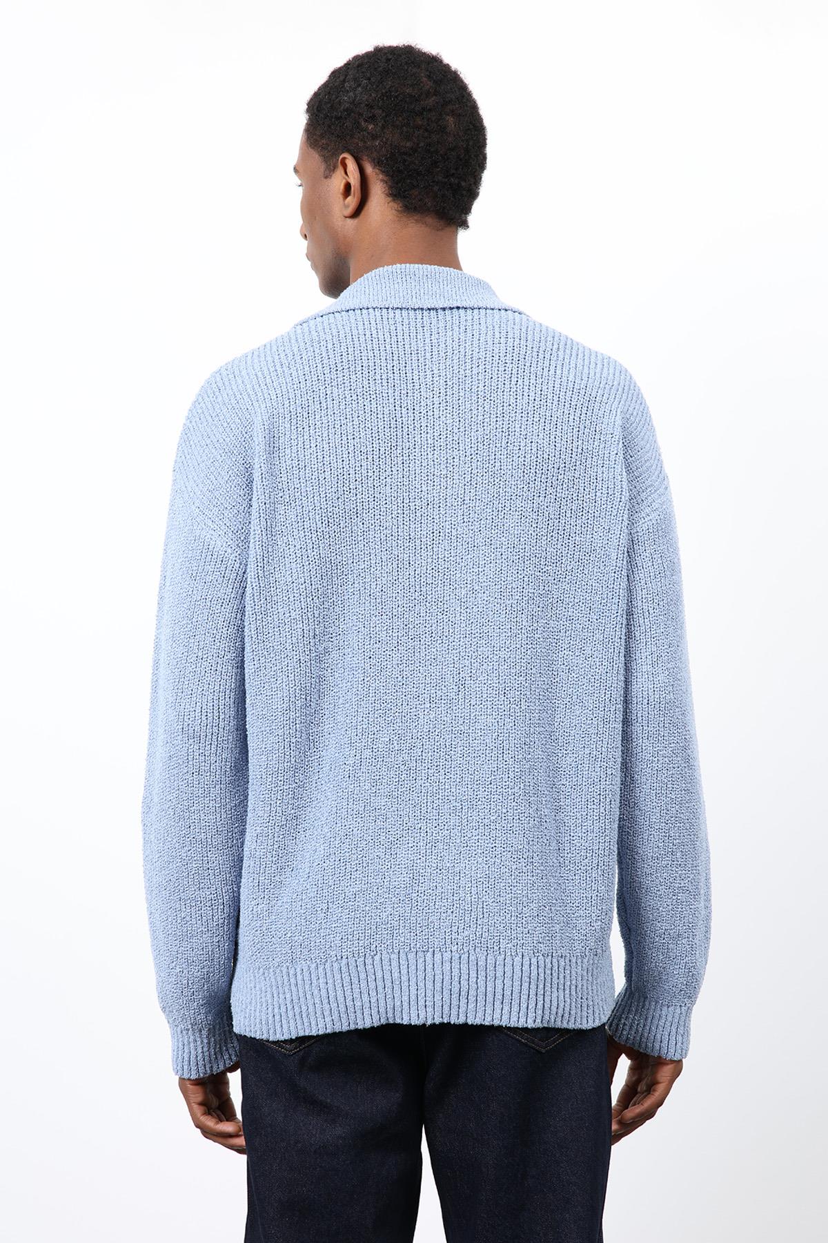 Ferahlık hissi veren bebe mavi tonu ve buklet dokulu örme yapısıyla Bebe Mavi Örme Triko Erkek Hırka, modern ve rahat bir stil sunar. Relax fit kalıbı sayesinde vücuda sıkı oturmadan konforlu bir duruş sağlarken, polo yaka detayı parçaya zamansız ve dengeli bir şıklık kazandırır.