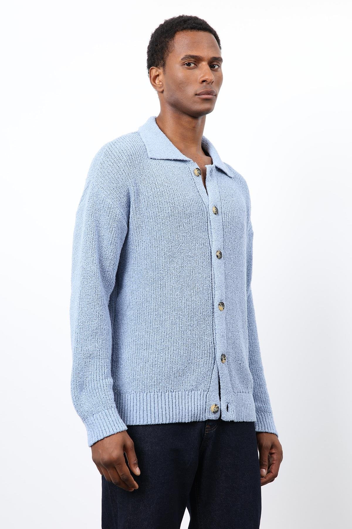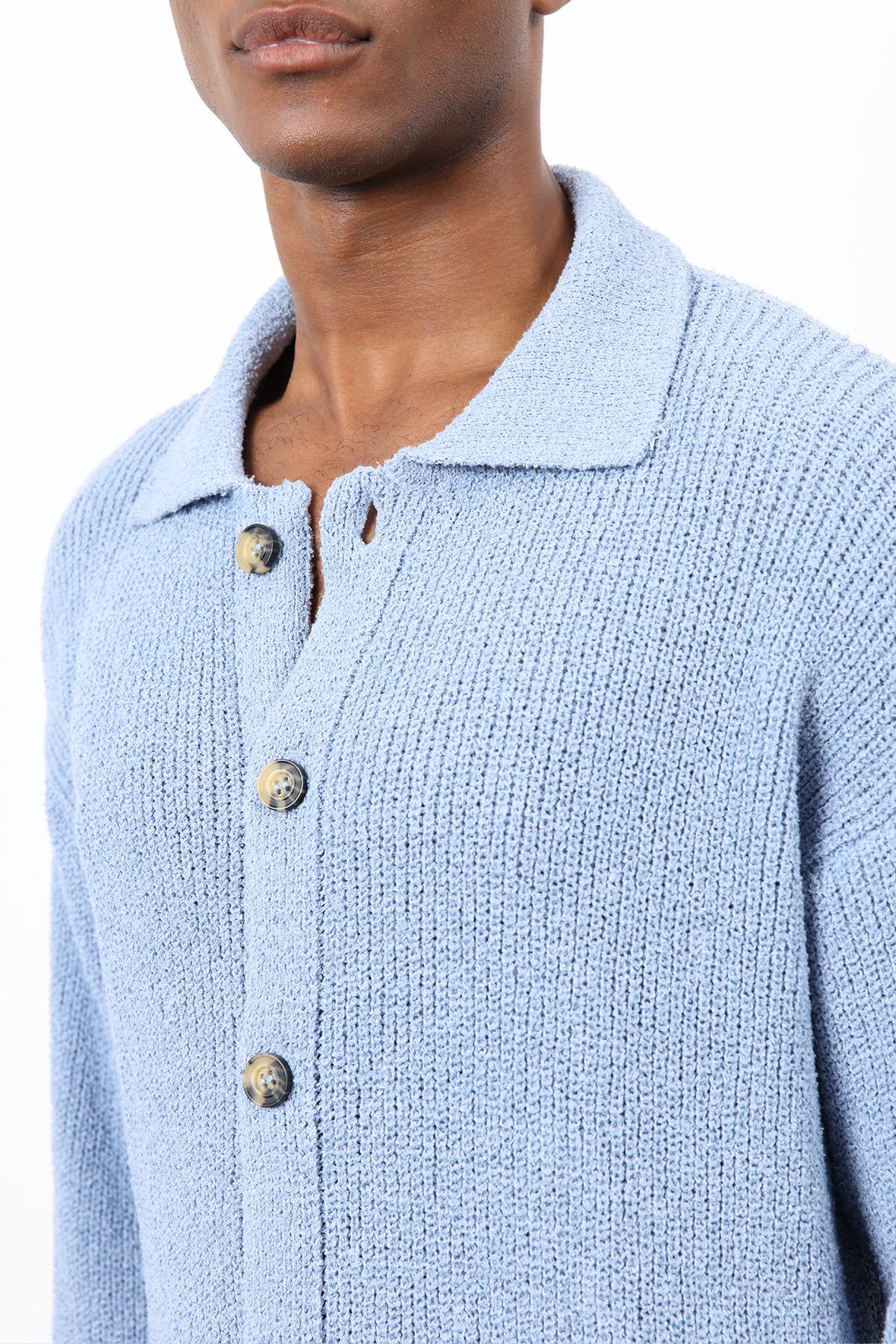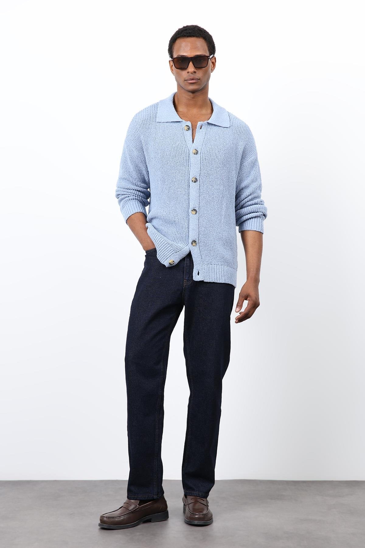 Ferahlık hissi veren bebe mavi tonu ve buklet dokulu örme yapısıyla Bebe Mavi Örme Triko Erkek Hırka, modern ve rahat bir stil sunar. Relax fit kalıbı sayesinde vücuda sıkı oturmadan konforlu bir duruş sağlarken, polo yaka detayı parçaya zamansız ve dengeli bir şıklık kazandırır.