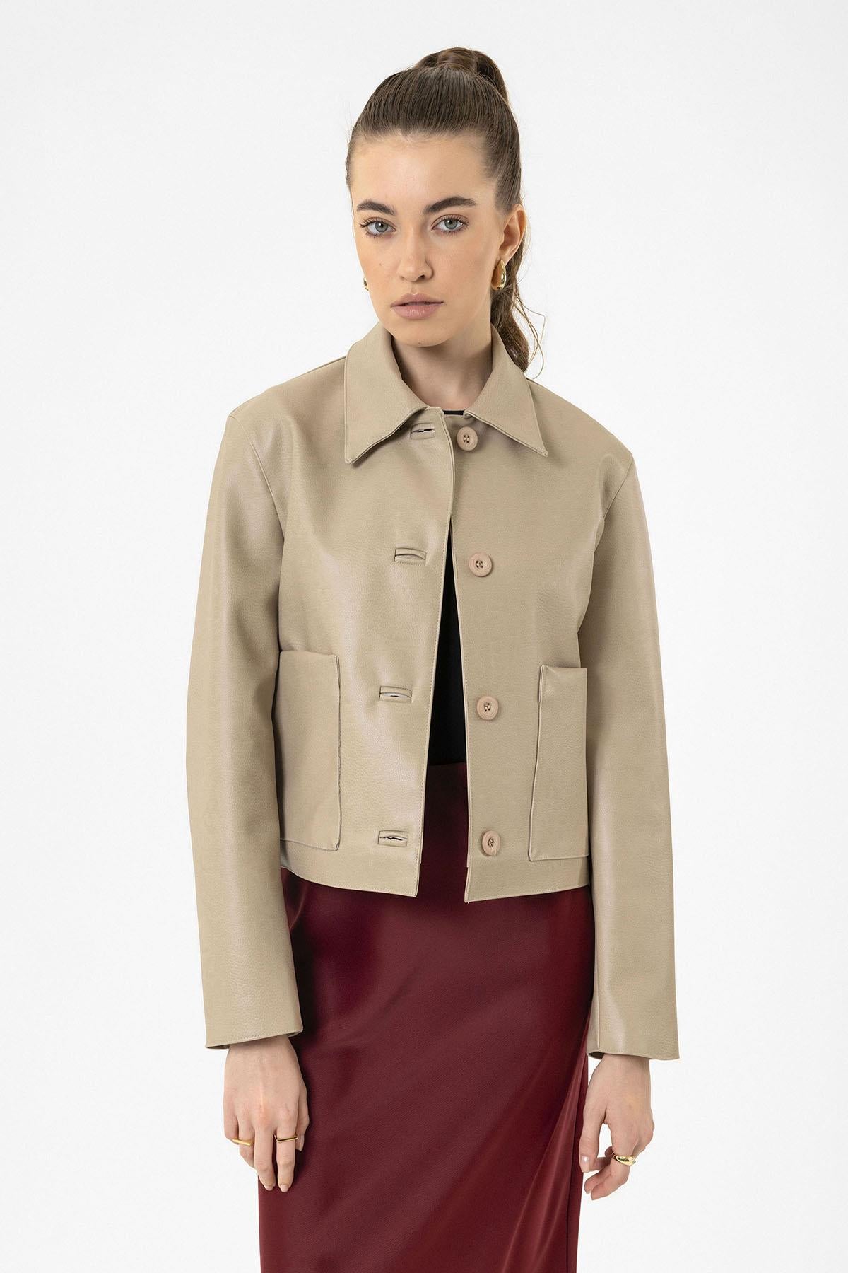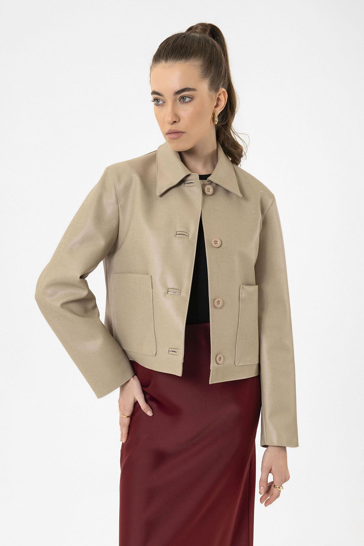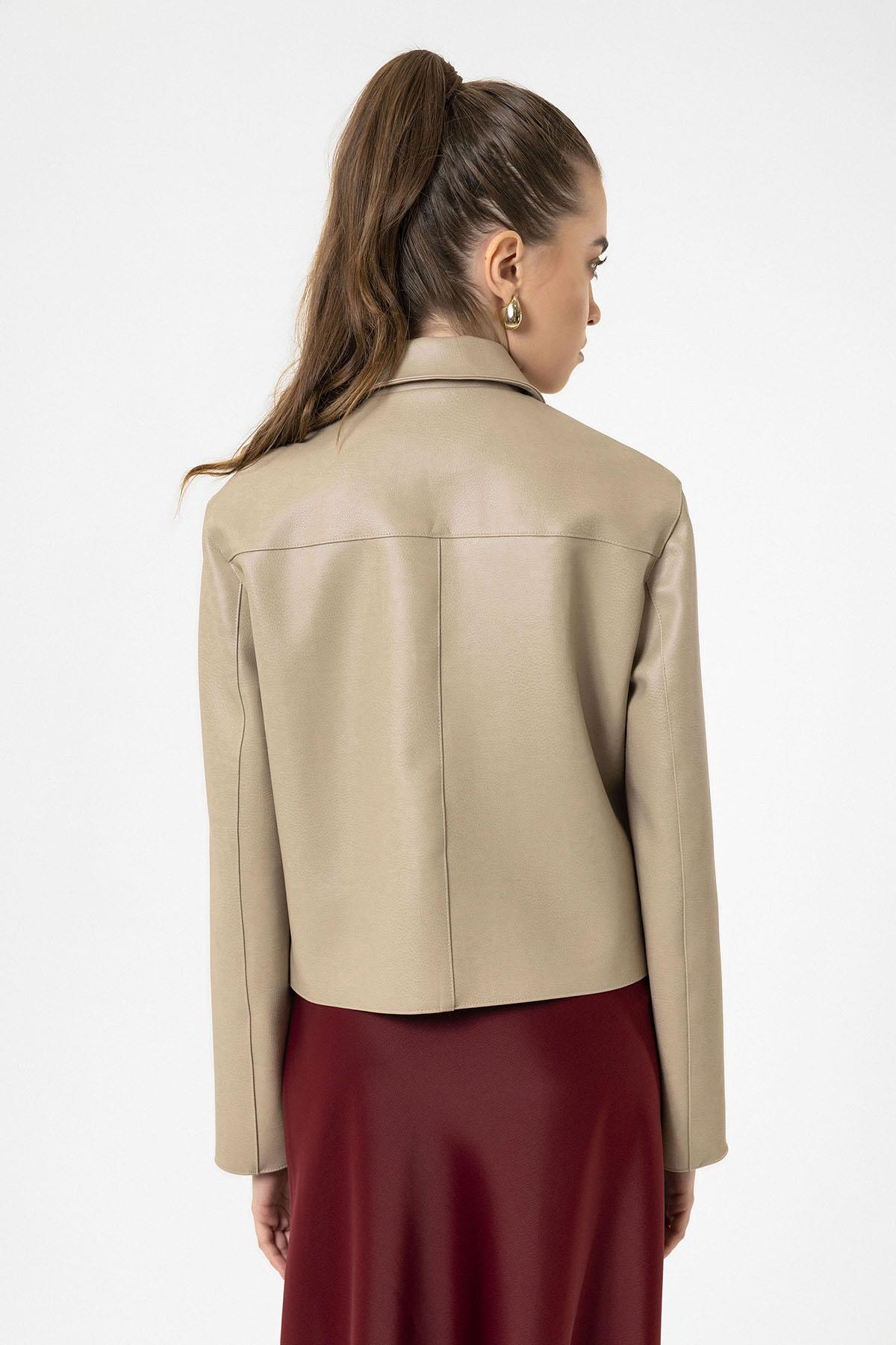 Bej Kadın Polo Yaka Suni Deri Ceket