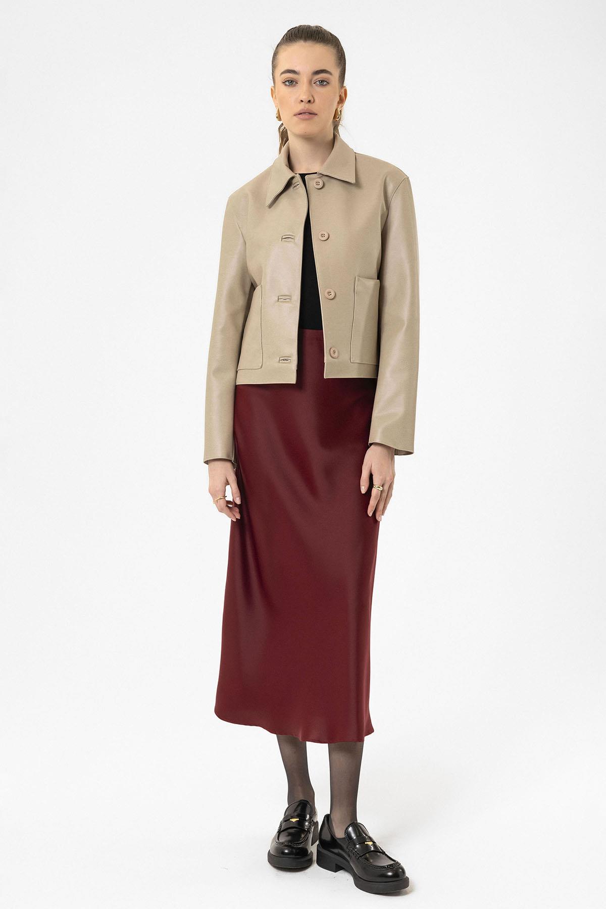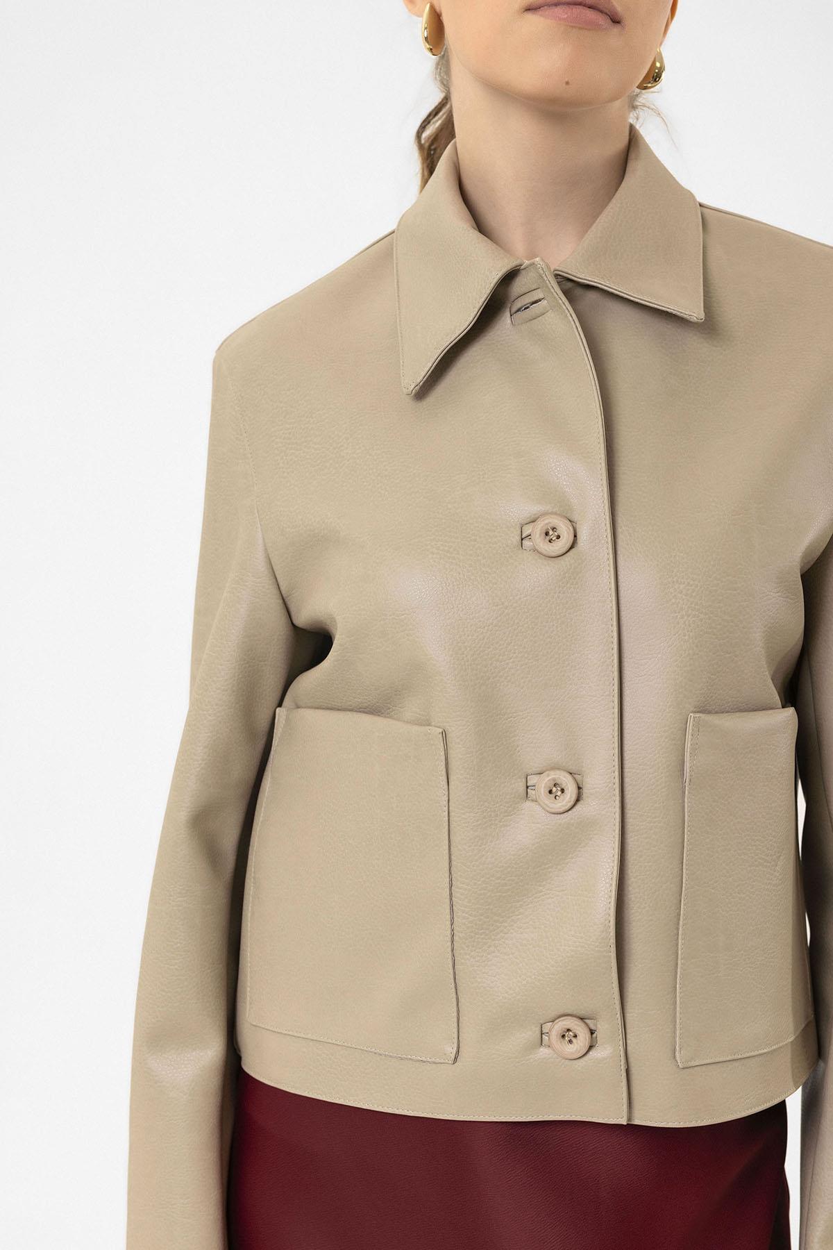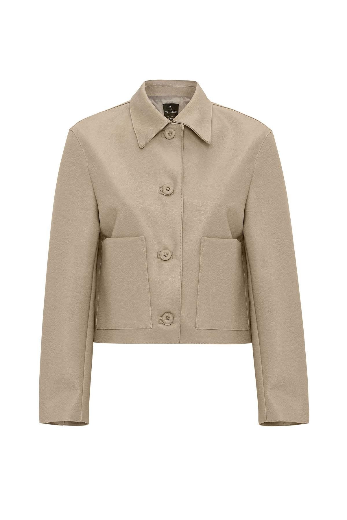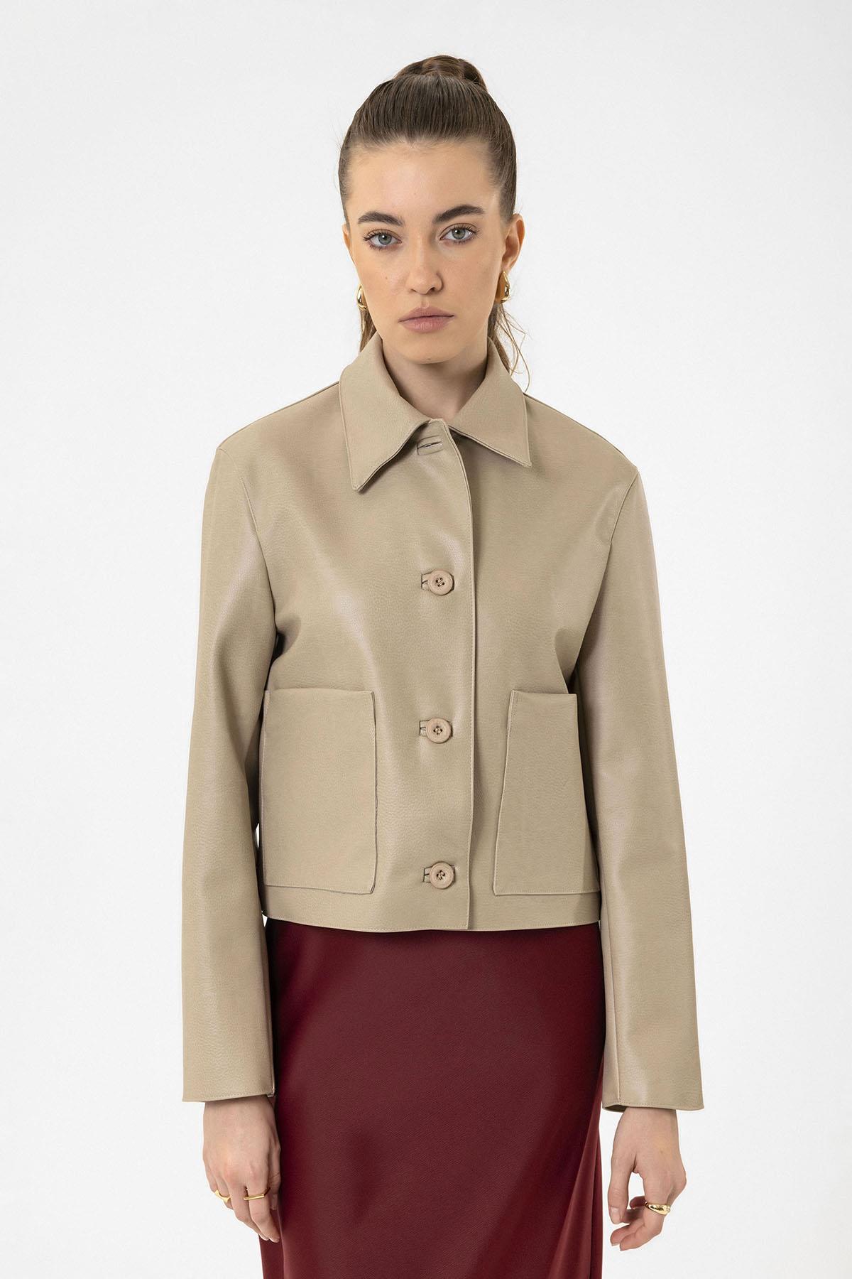 Bej Kadın Polo Yaka Suni Deri Ceket