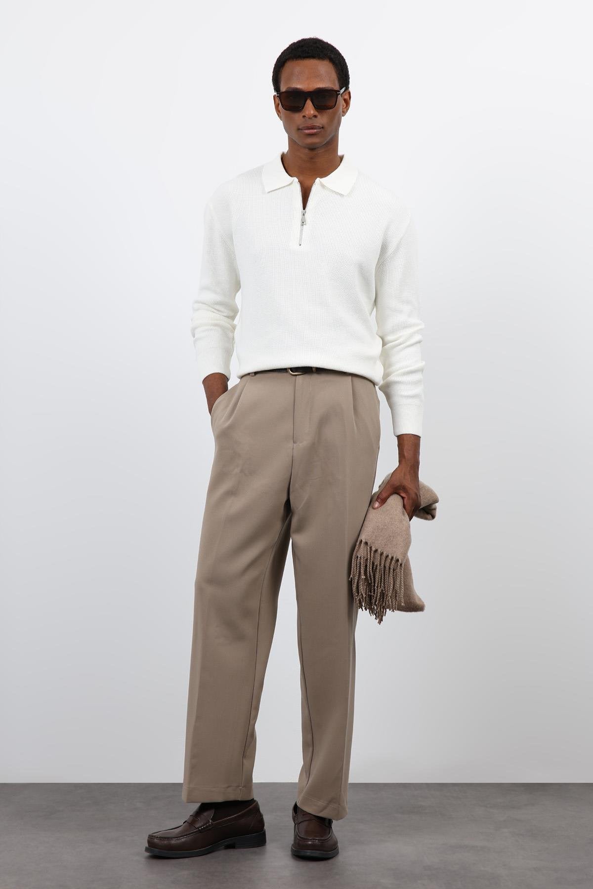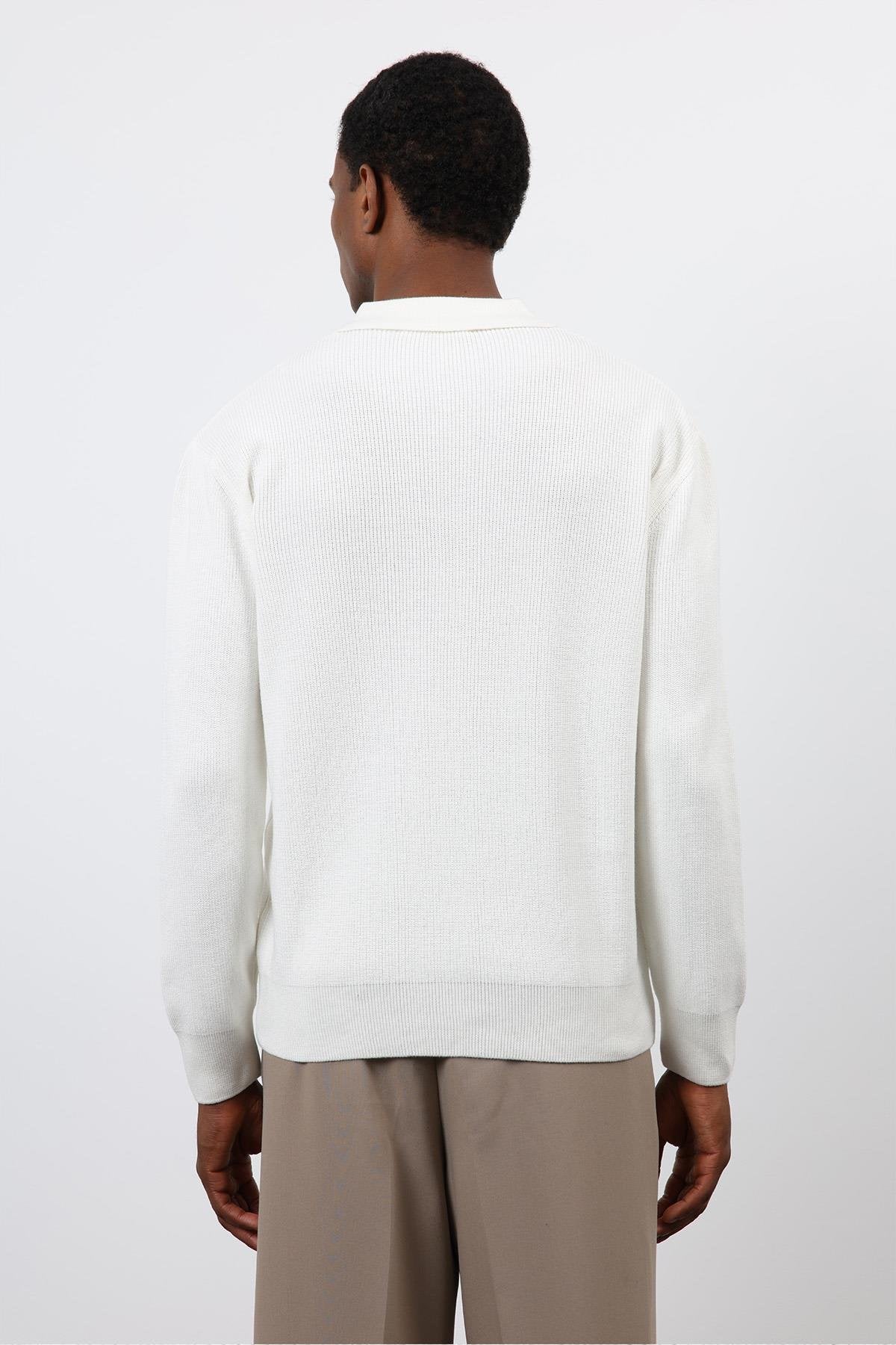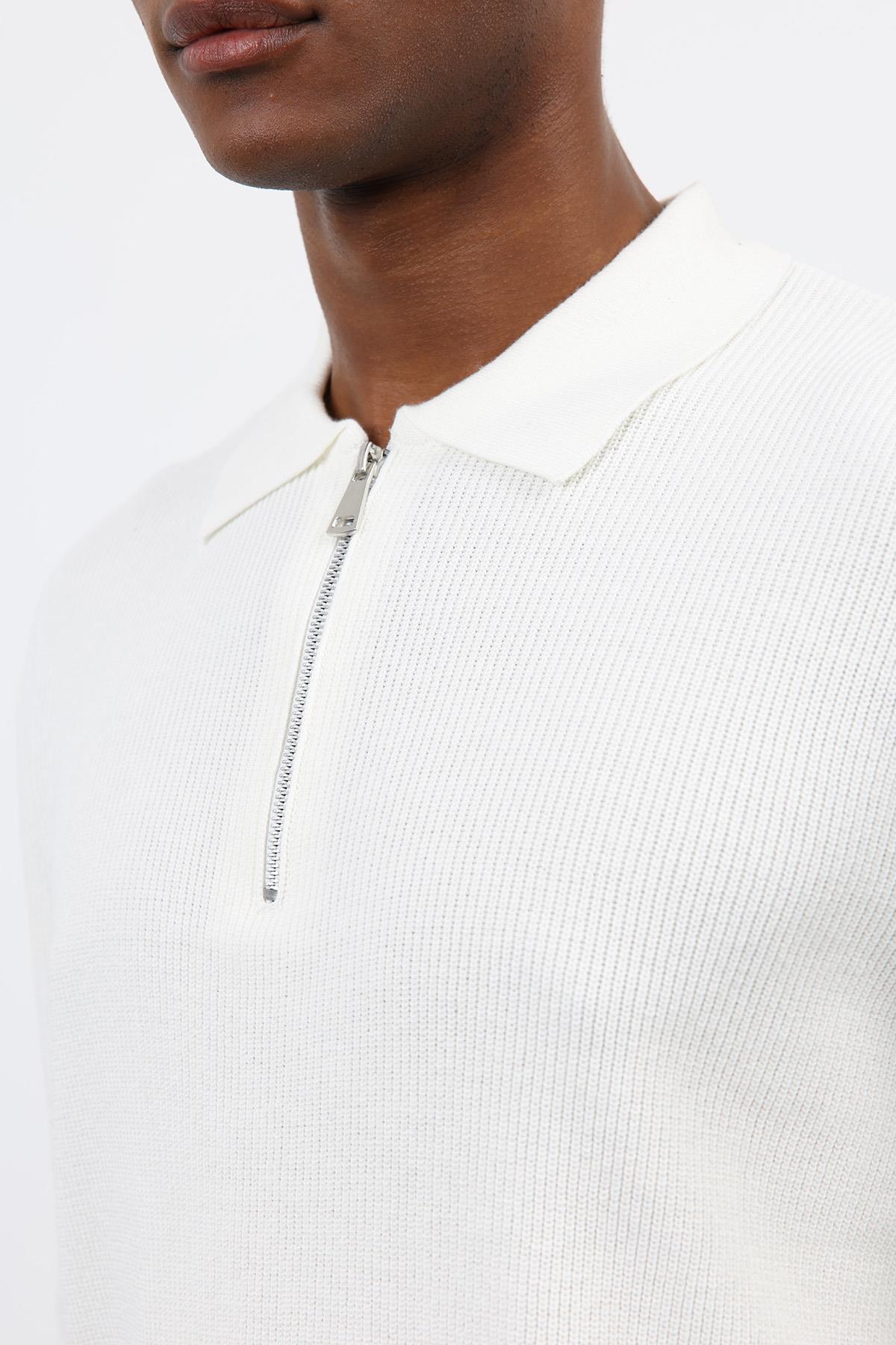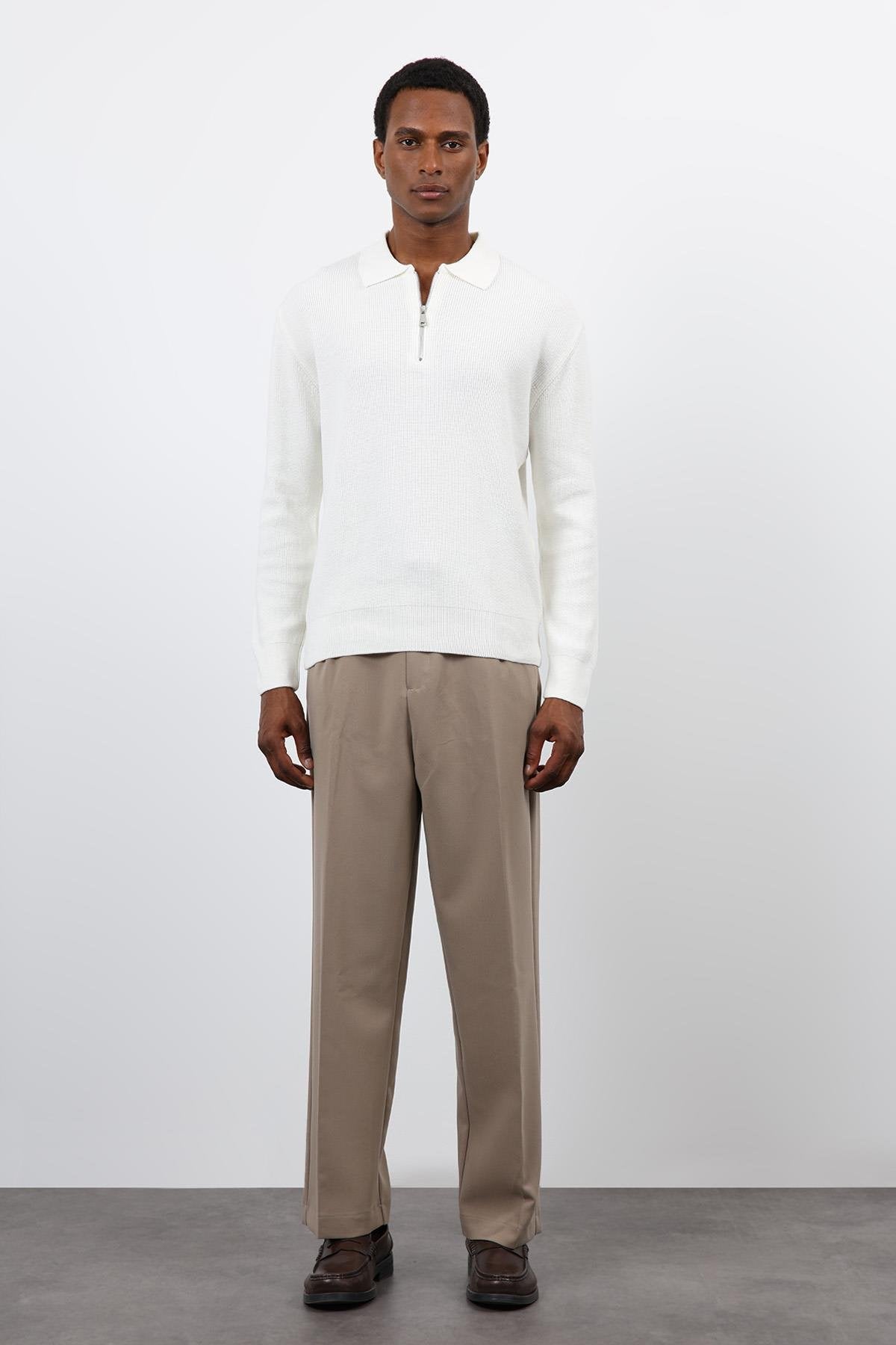 Ekru Fermuarlı Erkek Triko Kazak