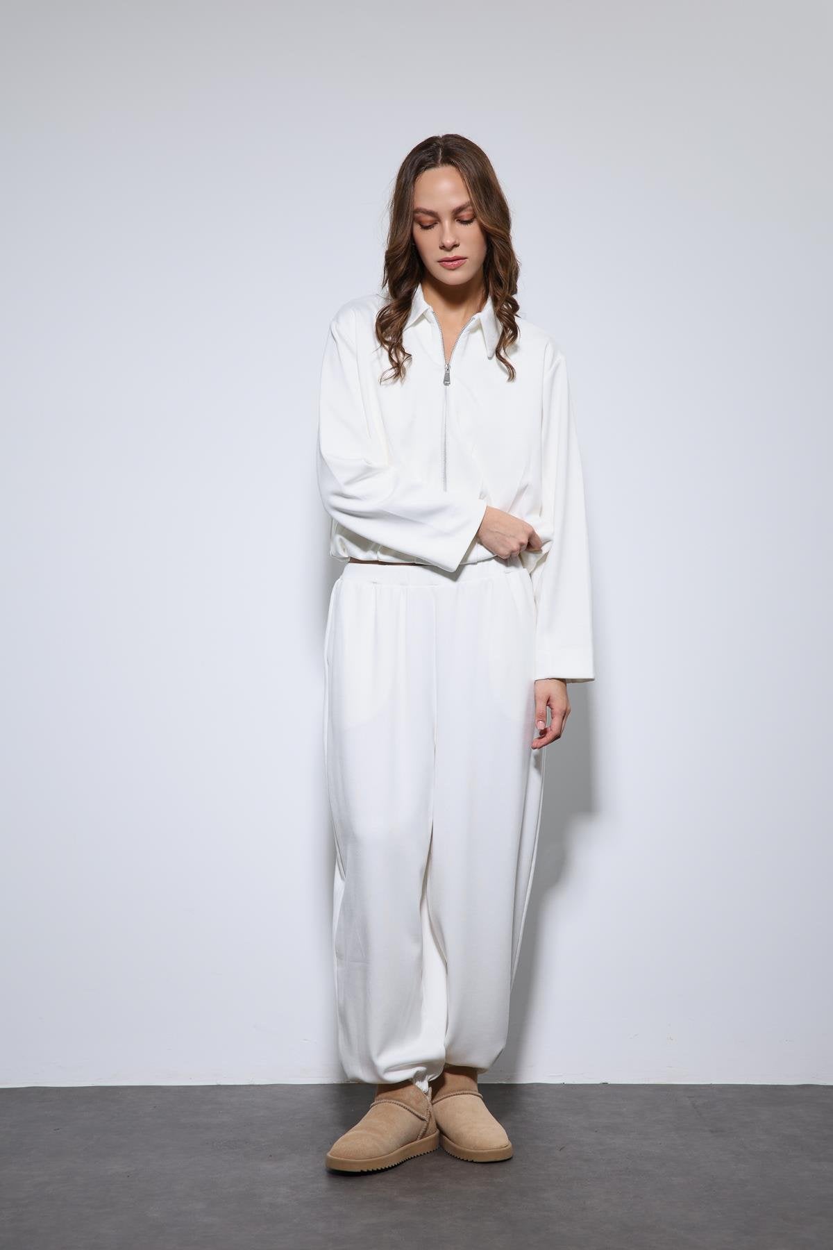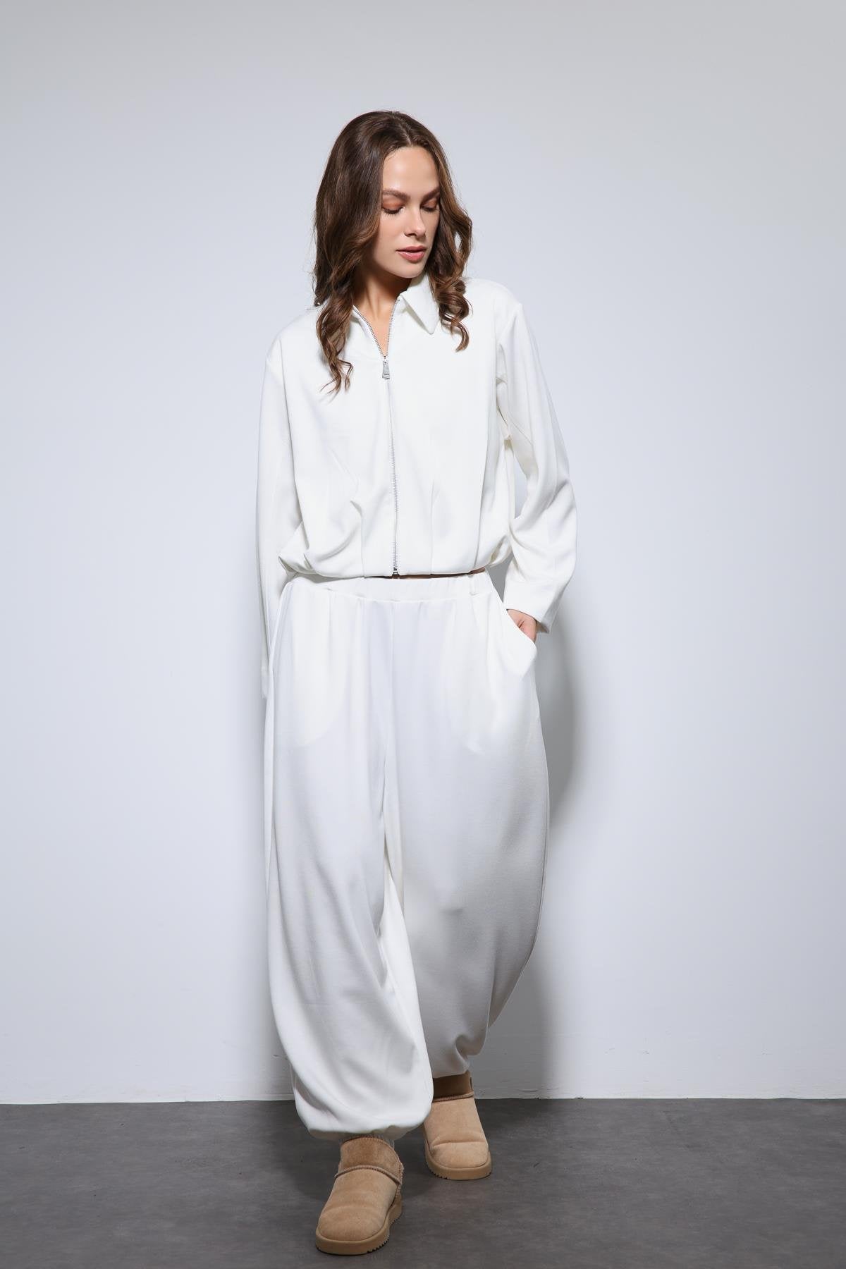 Ekru Volümlü Ceket ve Paça Lastikli Eşofman Takım