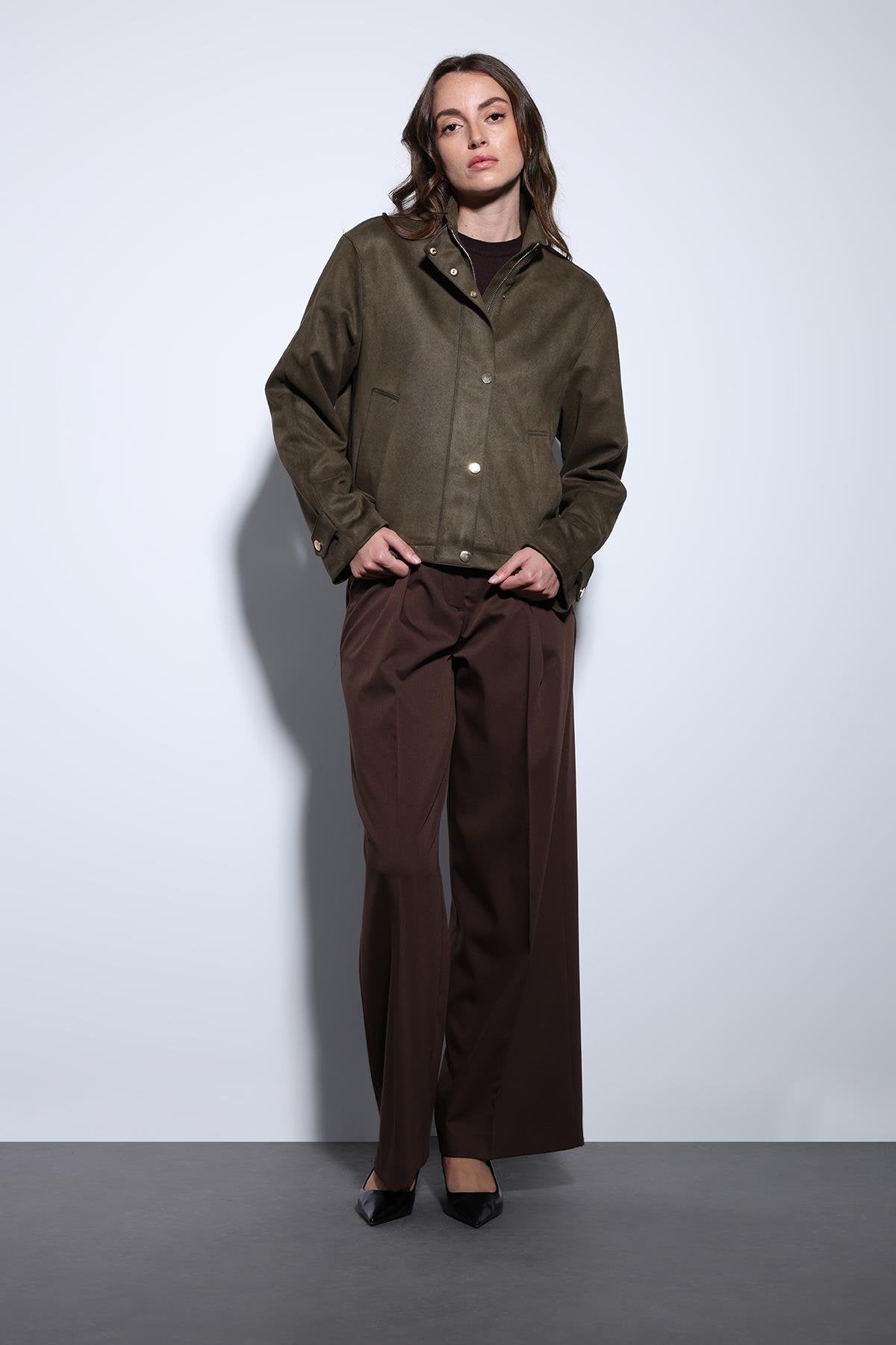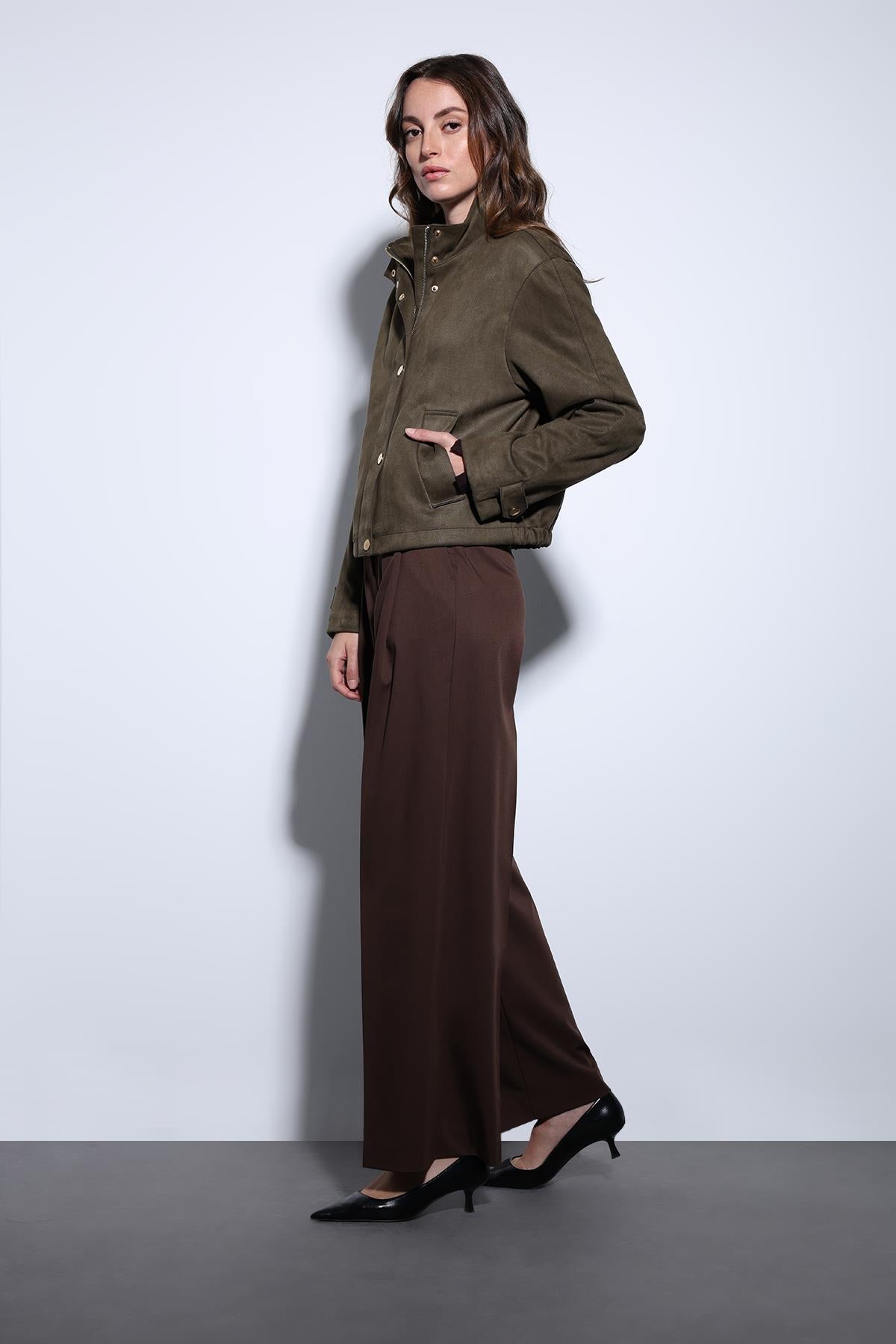 Haki renkte, süet dokulu bomber ceket modelidir. Dik yaka, fermuar ve çıtçıt kapama detaylarıyla modern ve kullanışlı bir yapı sunar. Fleto cepleri sayesinde pratik ve rahat bir kullanım sağlar. Sonbahar ve kış sezonu için günlük şehir stiline kolayca uyum sağlar. Türkiye’de üretilmiştir.