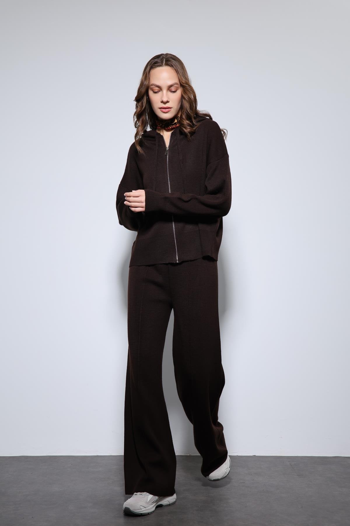 Kahve Kapüşonlu Üst ve Geniş Paça Triko Takım