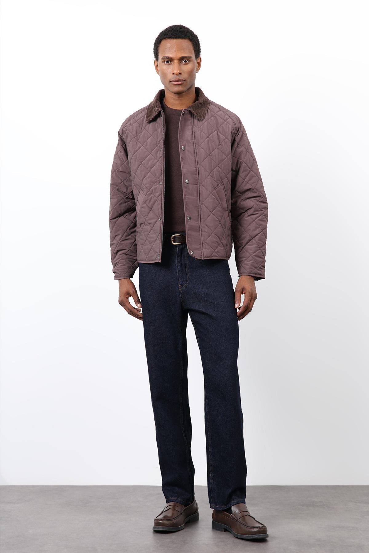 Kahve Kontrast Yaka Baklava Desenli Erkek Mont